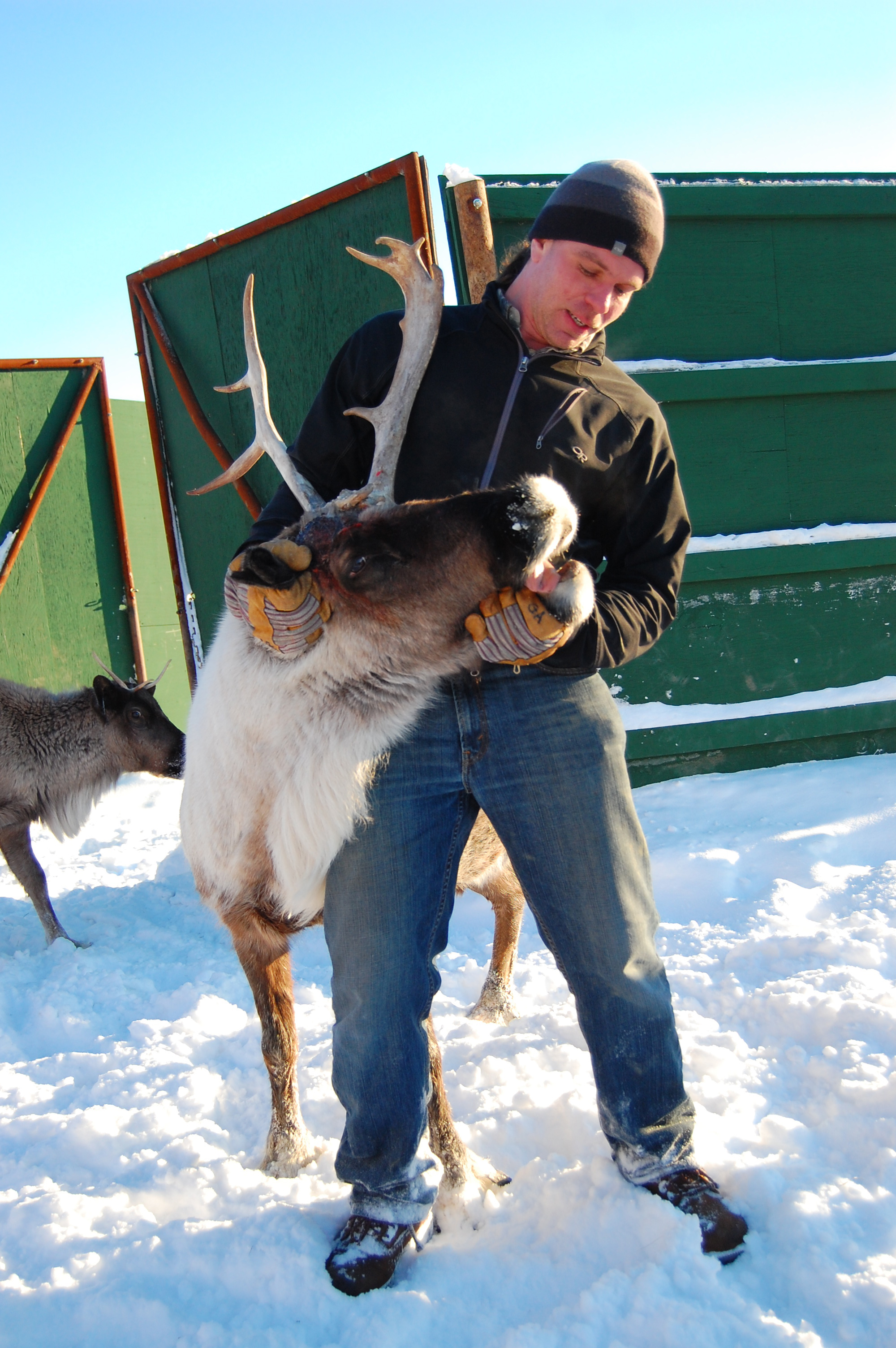 George Aguiar shows PolarTREC teachers how to keep reindeer under control by using pressure points. At the Reindeer Research Farm in Fairbanks, Alaska.