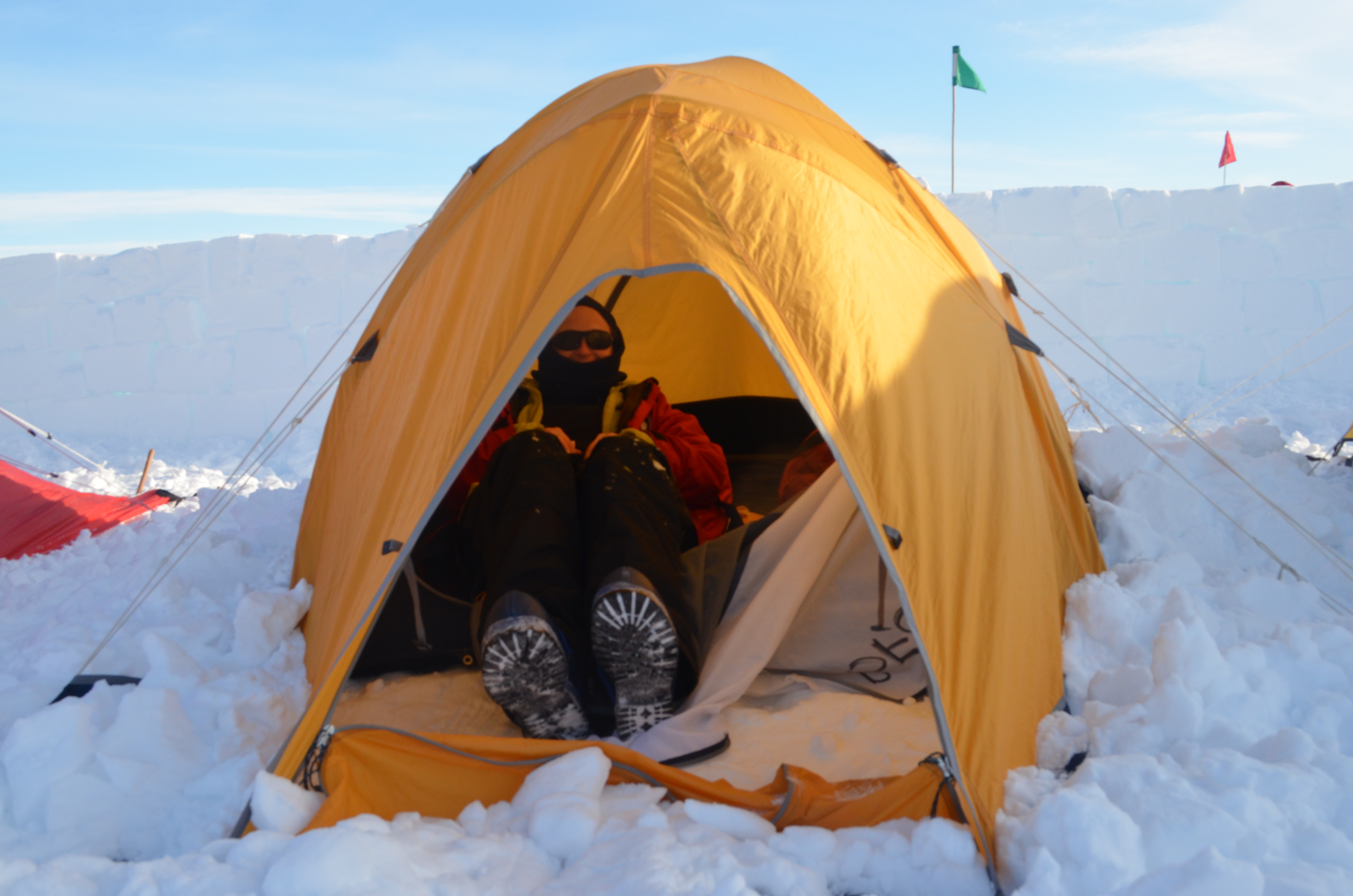 Joni Kincaid, Michelle Brown's camping buddy, is ready for sleep in the tent. At the Happy Camper School near McMurdo Station, Antarctica.