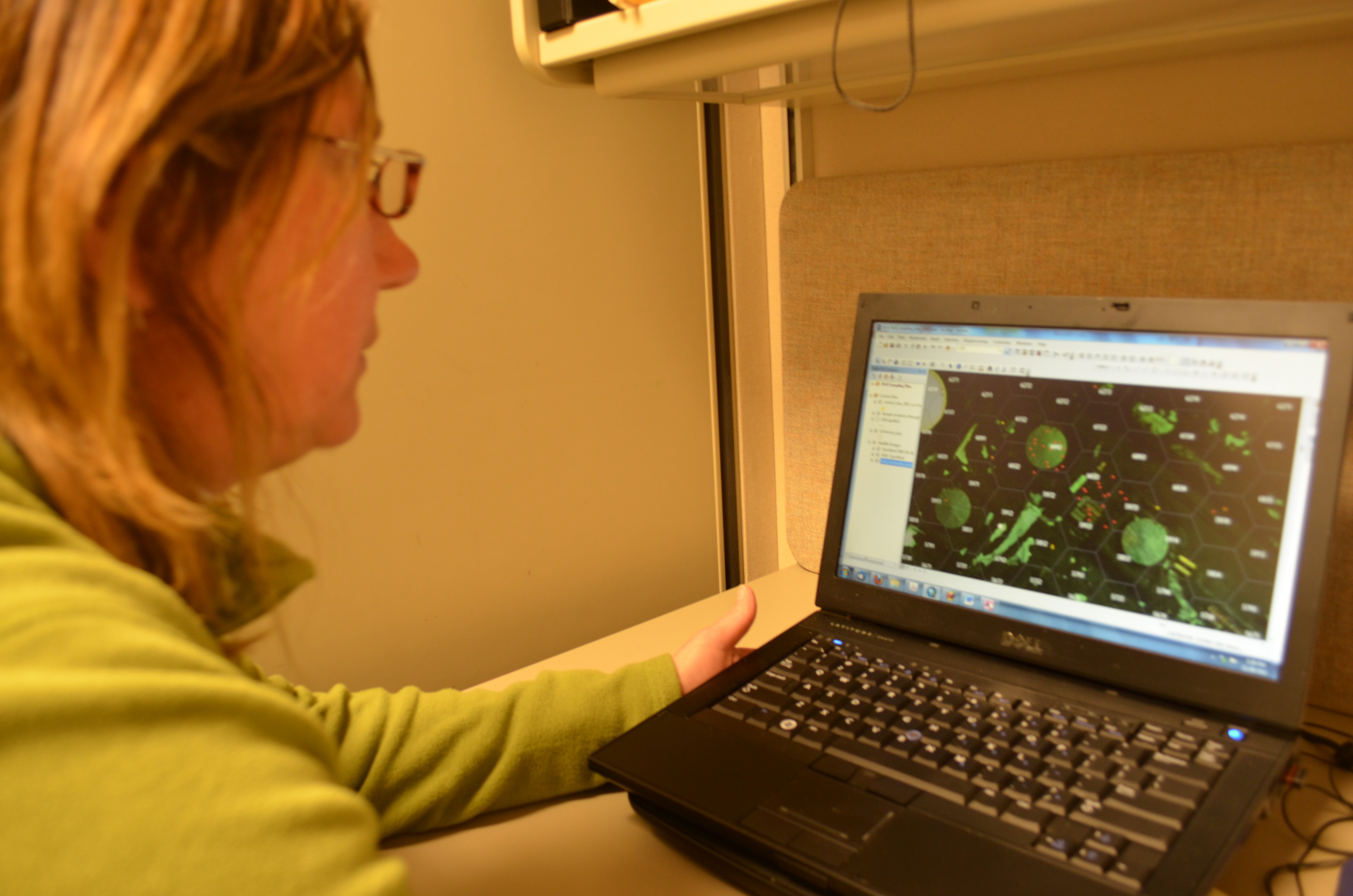 Joni Kincaid locates sampling sites around McMurdo Station before collecting sediment samples. McMurdo Station, Antarctica.