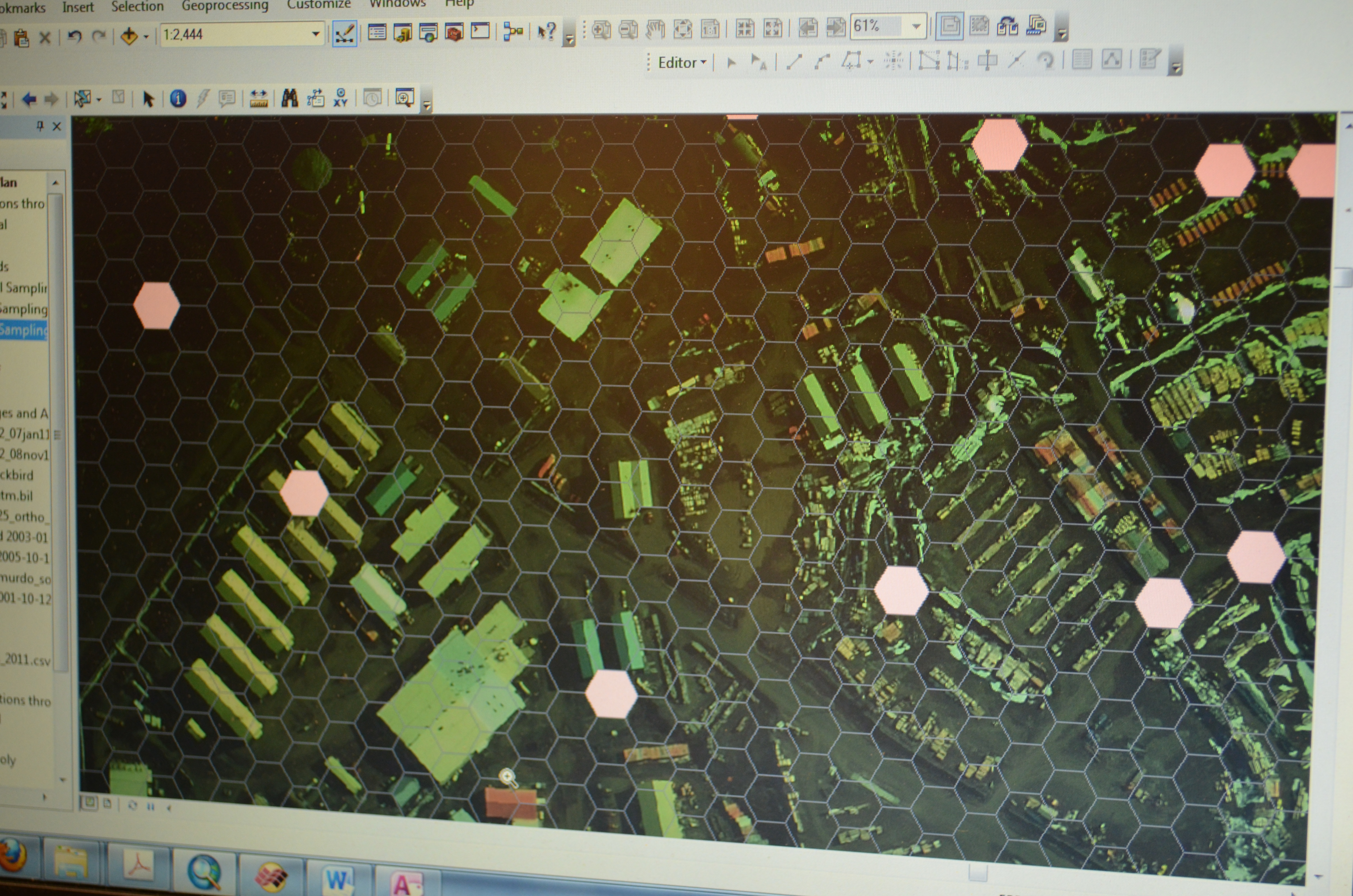 A pattern of hexagons cover a map of McMurdo Station to randomly select sampling sites. McMurdo Station, Antarctica.