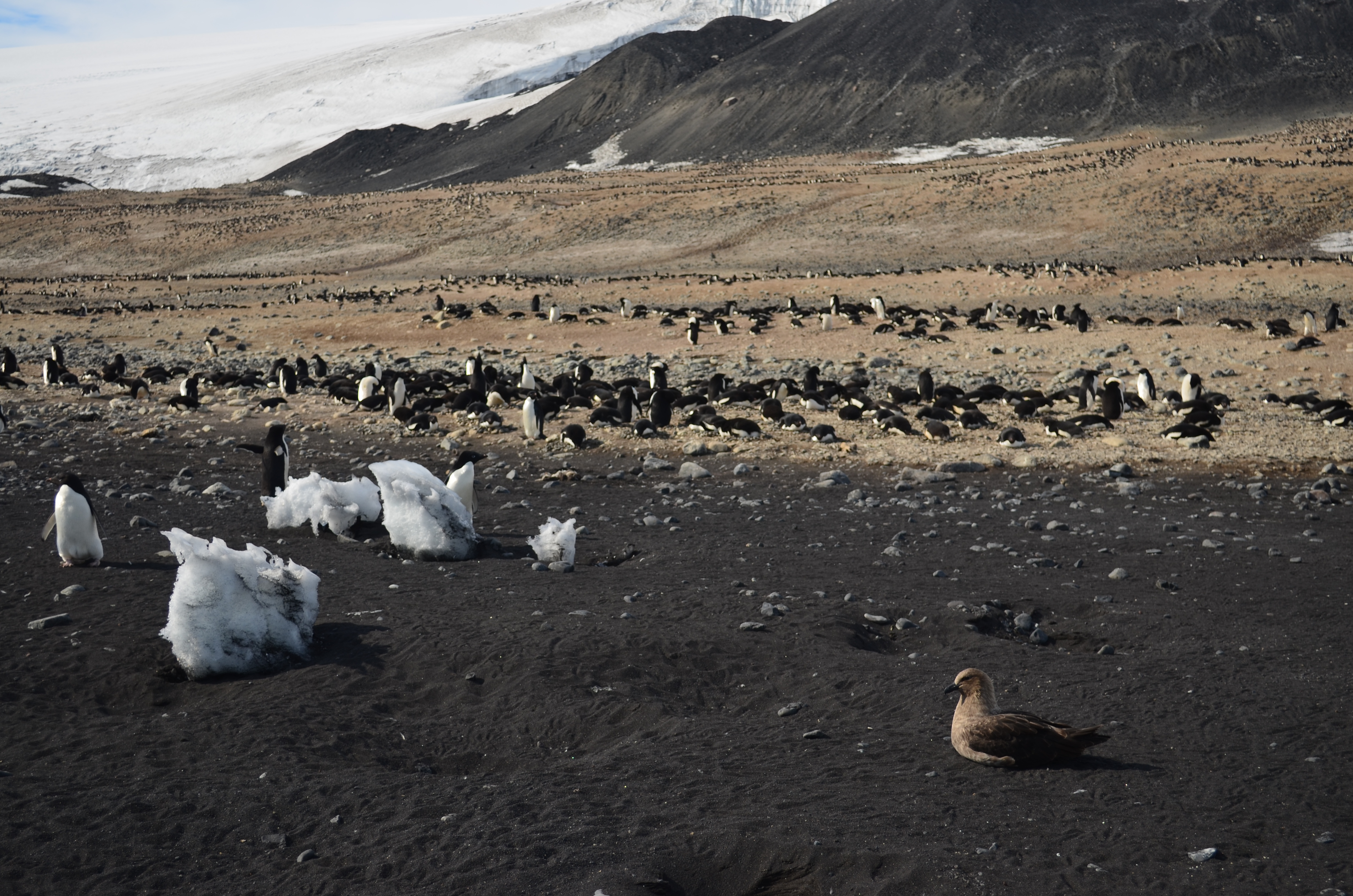 A skua, a predator of the Adélie penguins, sits near the rookery where Adélies lie on their eggs. Cape Bird, Antarctica.