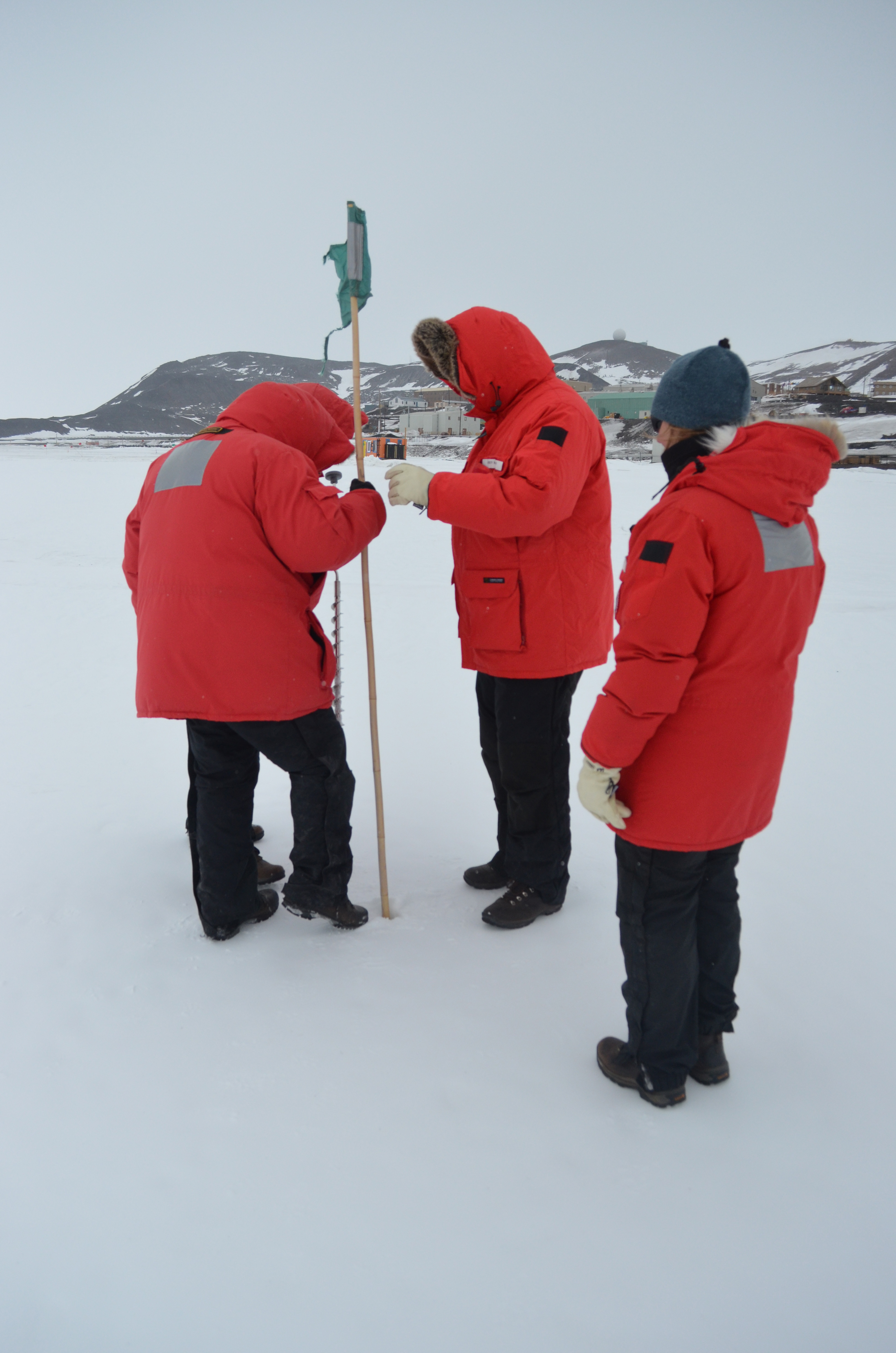 Michelle Brown, Steve Sweet, and Andrew Klein place the flag in the hole while Joni Kincaid supervises. McMurdo Station, Antarctica.