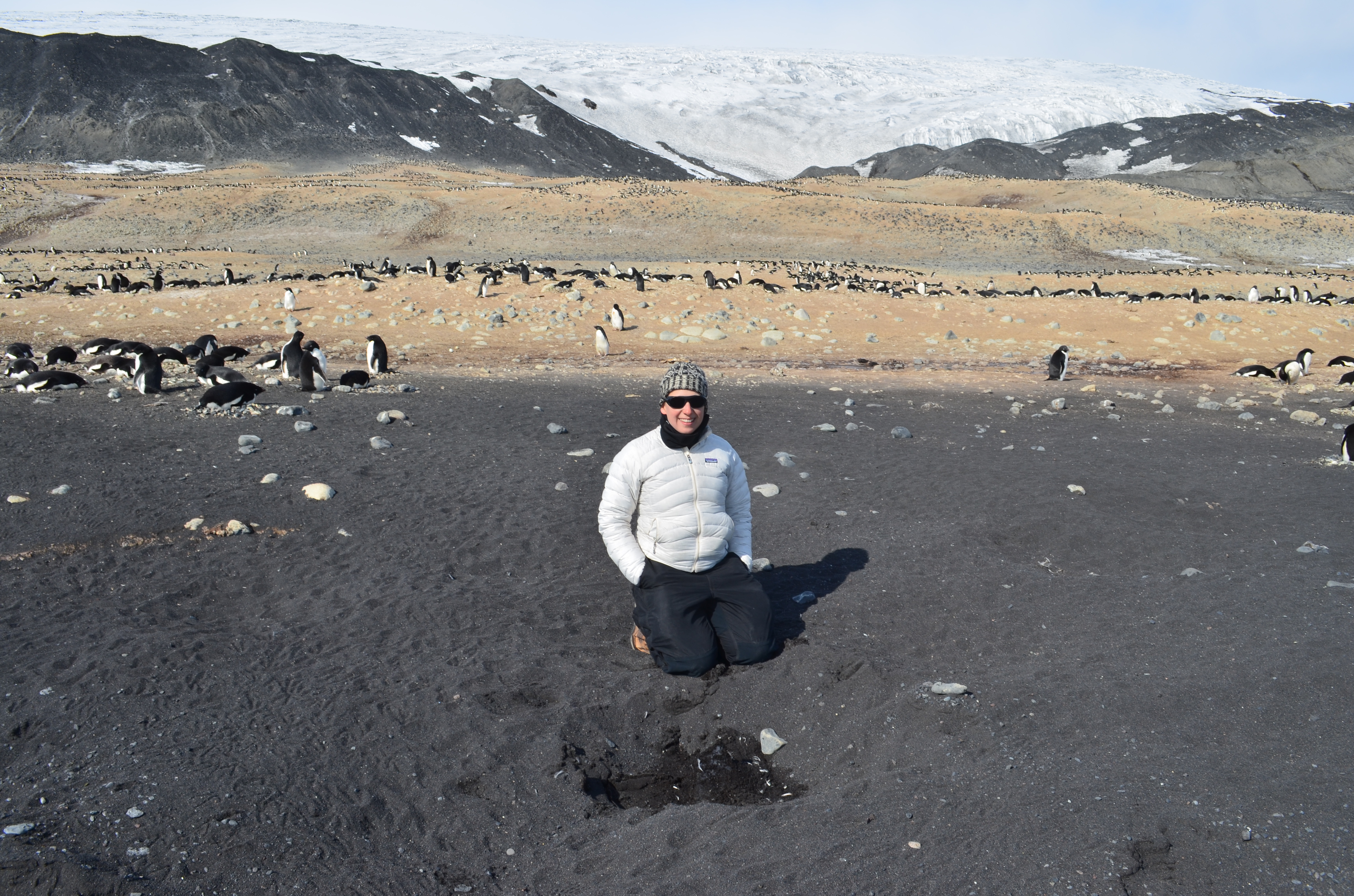 Michelle Brown sits down in front of a colony of Adélie penguins in Cape Bird, Antarctica.