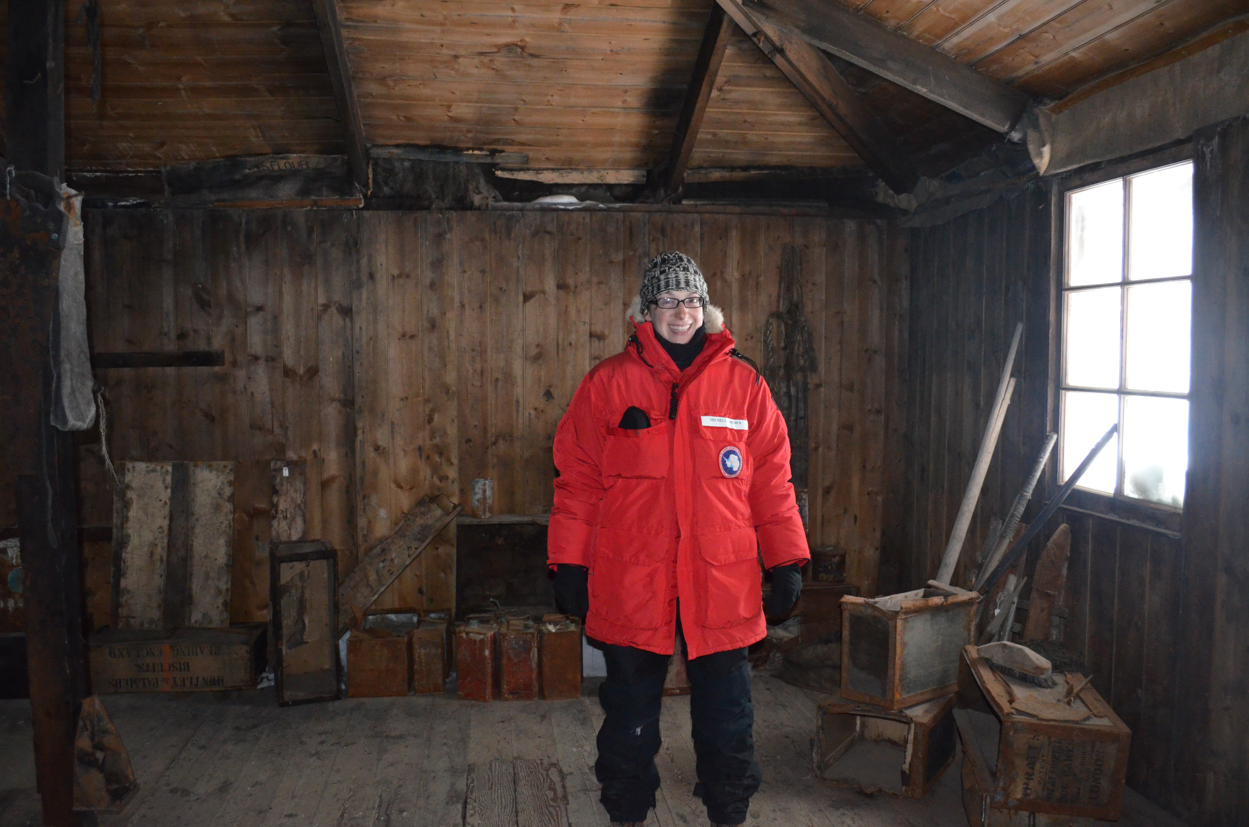Michelle Brown stands inside Discovery Hut amidst undisturbed boxes and expedition items. McMurdo Station, Antarctica.