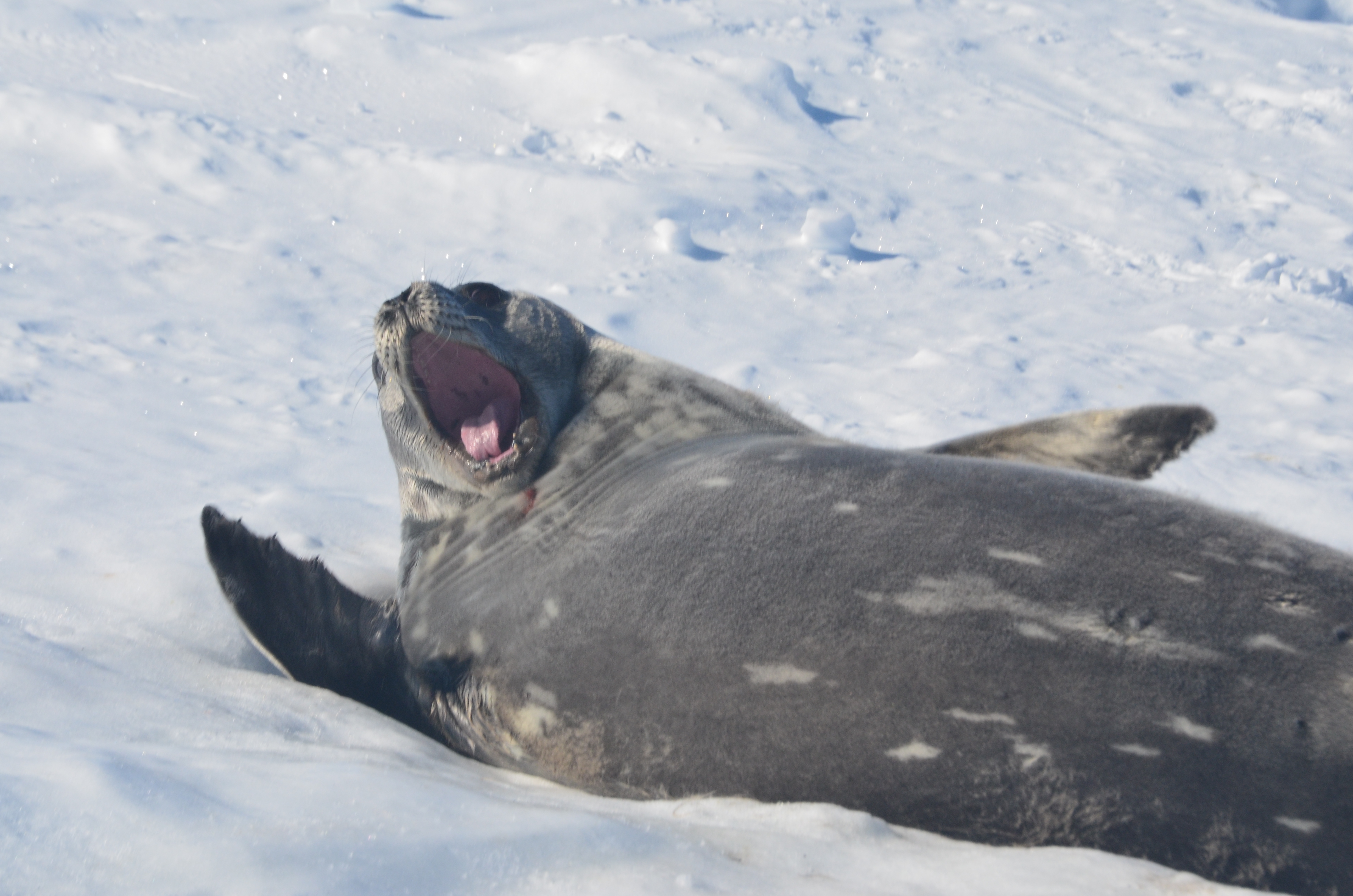 Michelle Brown: "A Weddell seal appears to wave goodbye while on basking in the sun." Turtle Rock, Antarctica.
