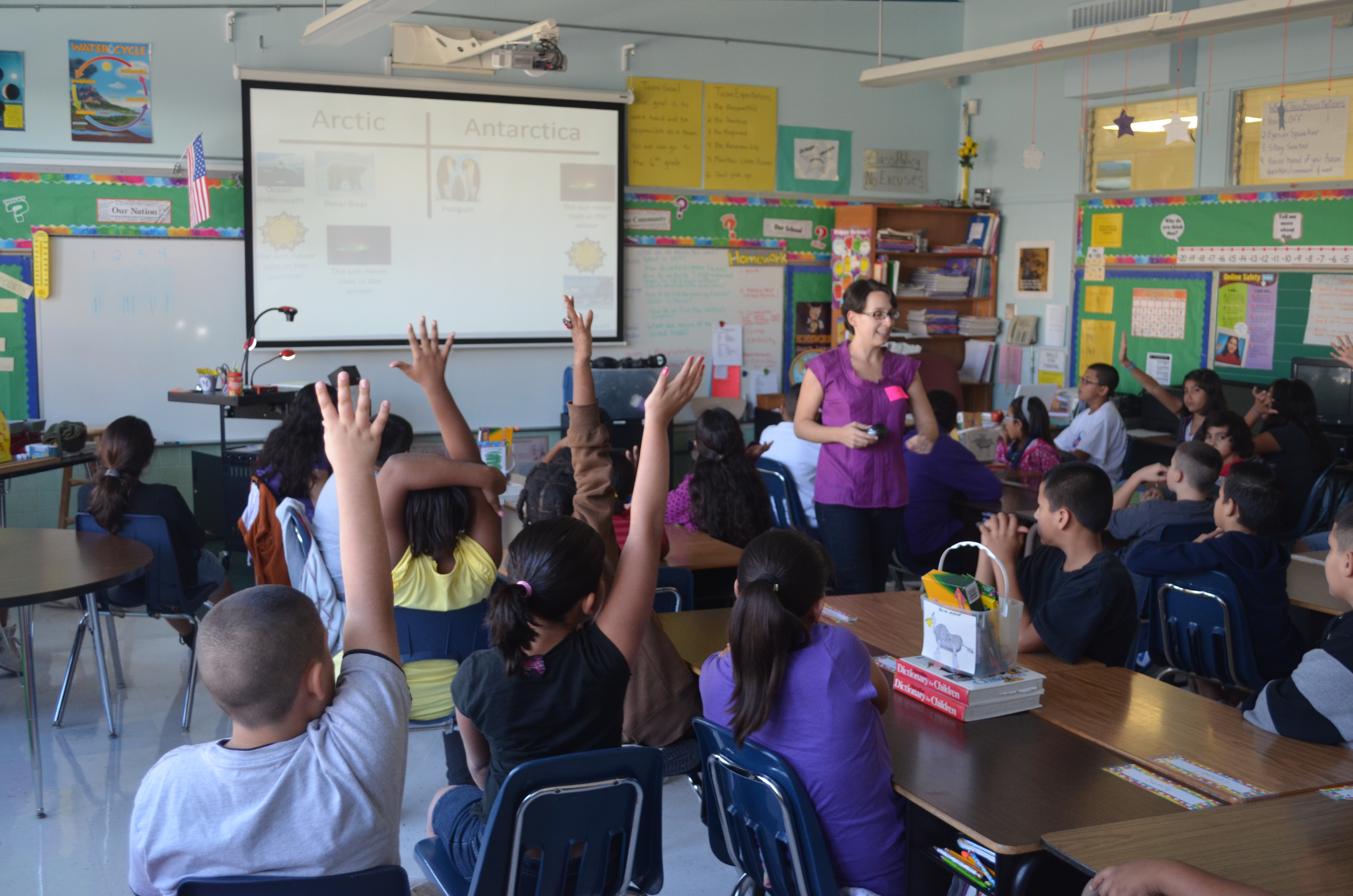 Students try to match the correct picture to the Arctic and Antarctic during a classroom visit from Michelle Brown. Ortega Elementary School in Austin, Texas.