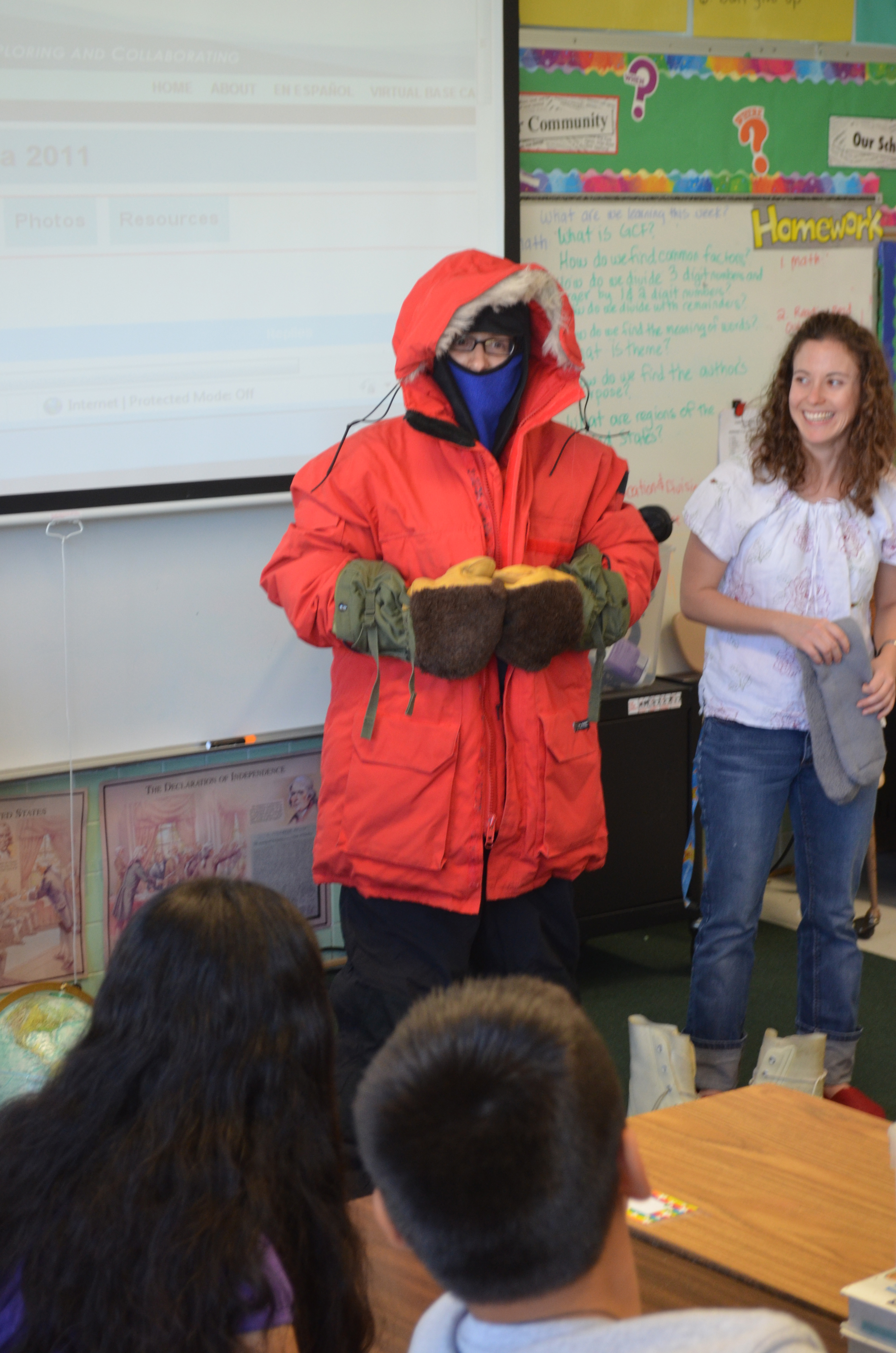 Michelle Brown tries on Extreme Cold Weather gear for students at Ortega Elementary School during a classroom visit. Ortega Elementary School in Austin, Texas.