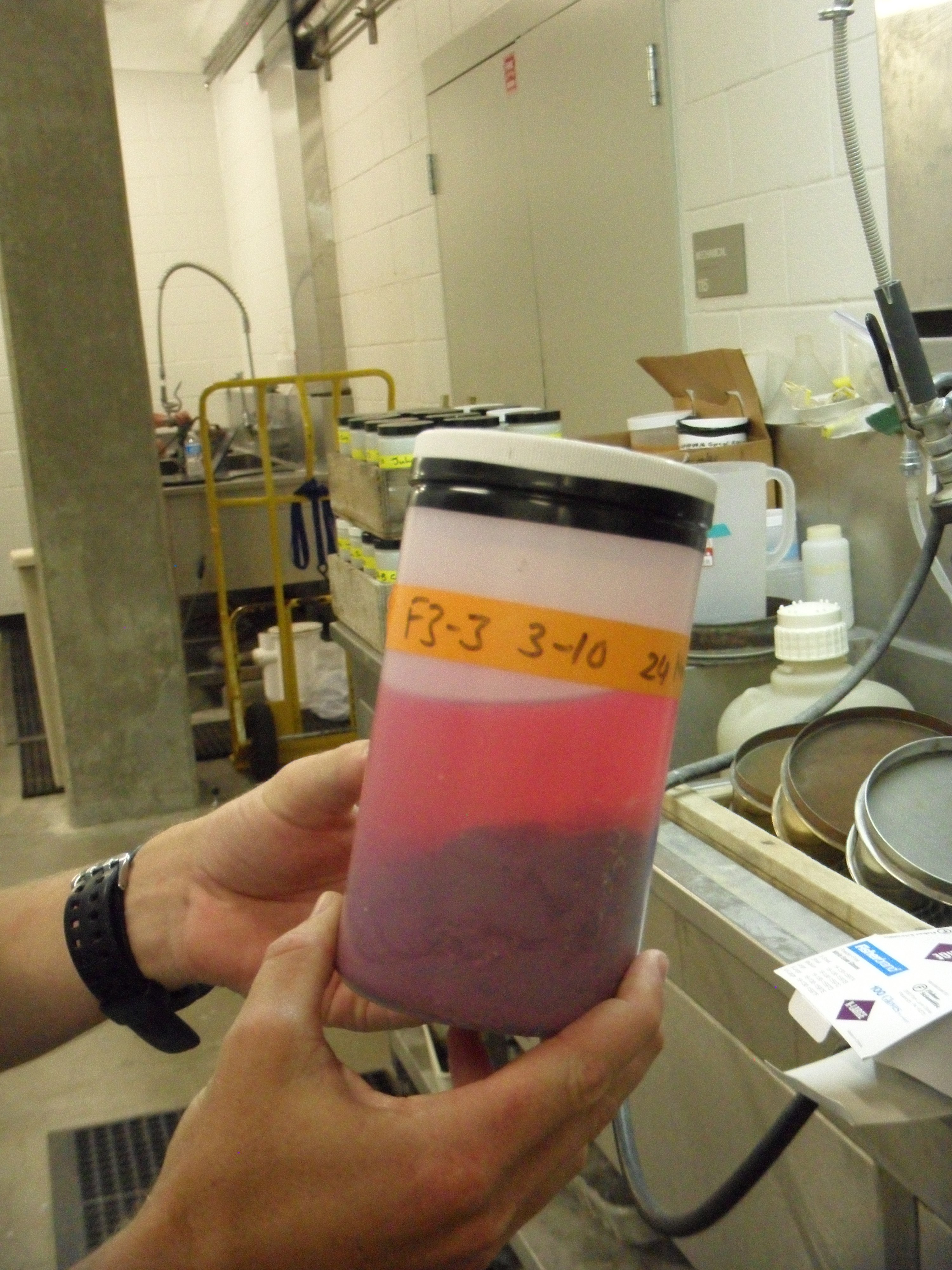 Terry Palmer shows a sediment sample of polychaete worms (died pink) from a prior year of collecting. Corpus Christi, Texas.