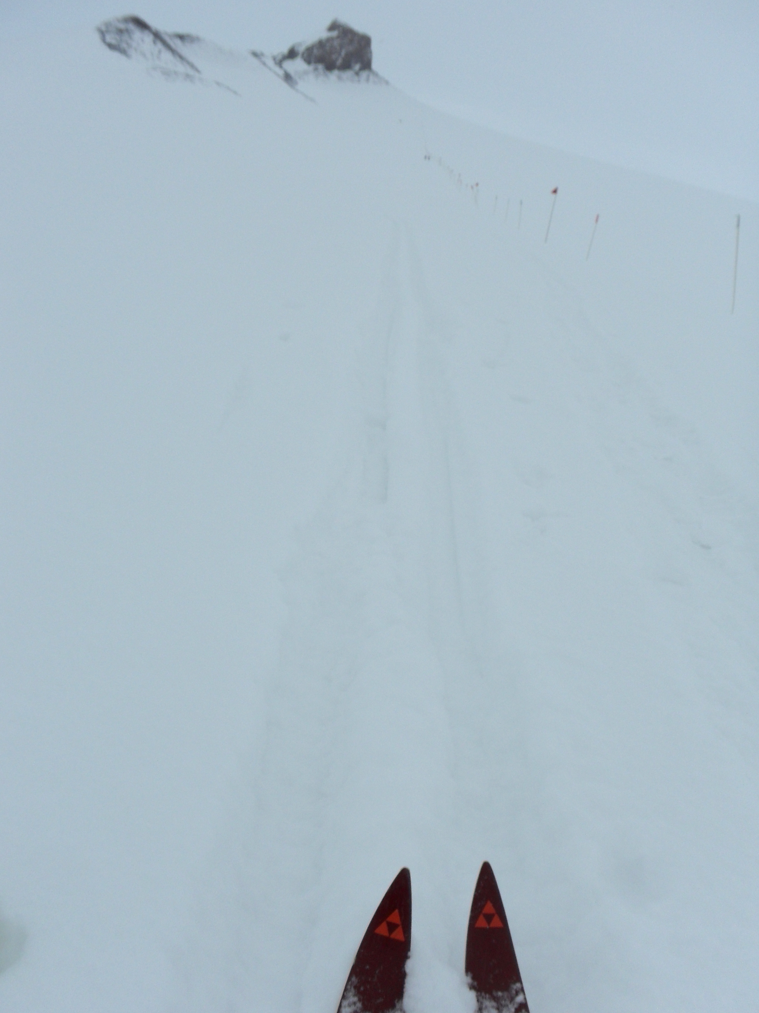 Flags mark the way to Castle Rock, which juts out of the snow, on the Castle Rock Trail. McMurdo Station, Antarctica.