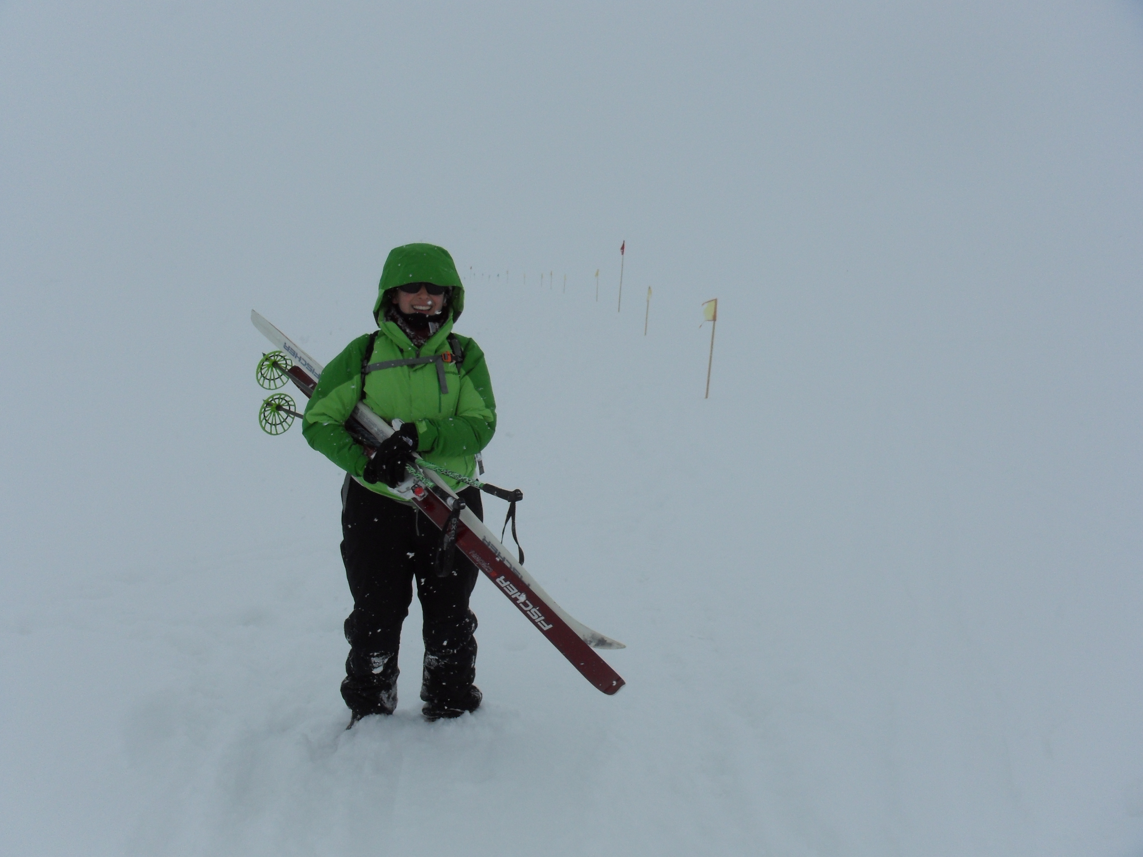 Michelle Brown poses with her cross country skis near the start of the Castle Rock Trail. McMurdo Station, Antarctica.