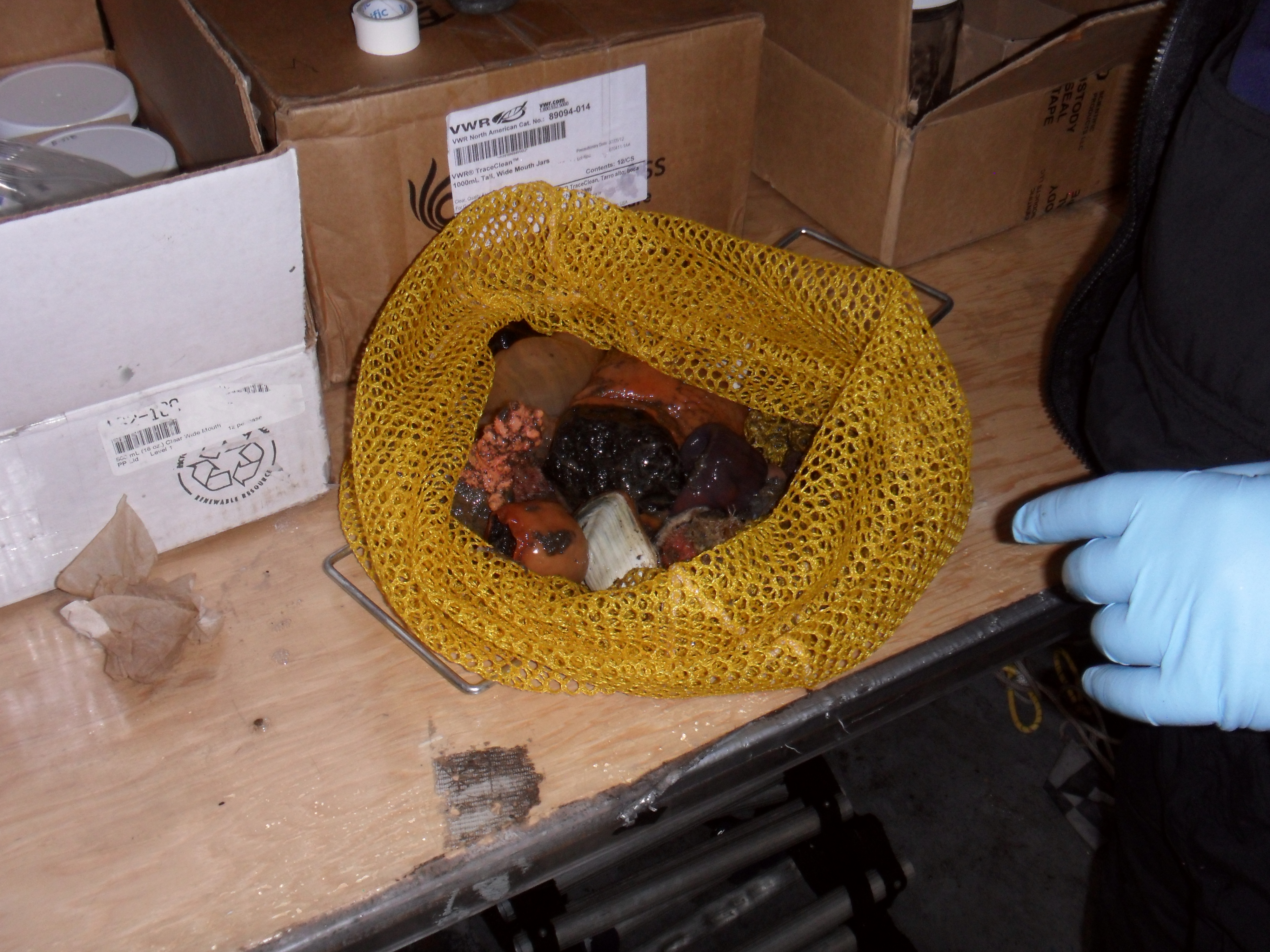Stephen Sweet sorts through the marine organisms collected on the seafloor that are to be tested for contaminants back in Texas. McMurdo Station, Antarctica.