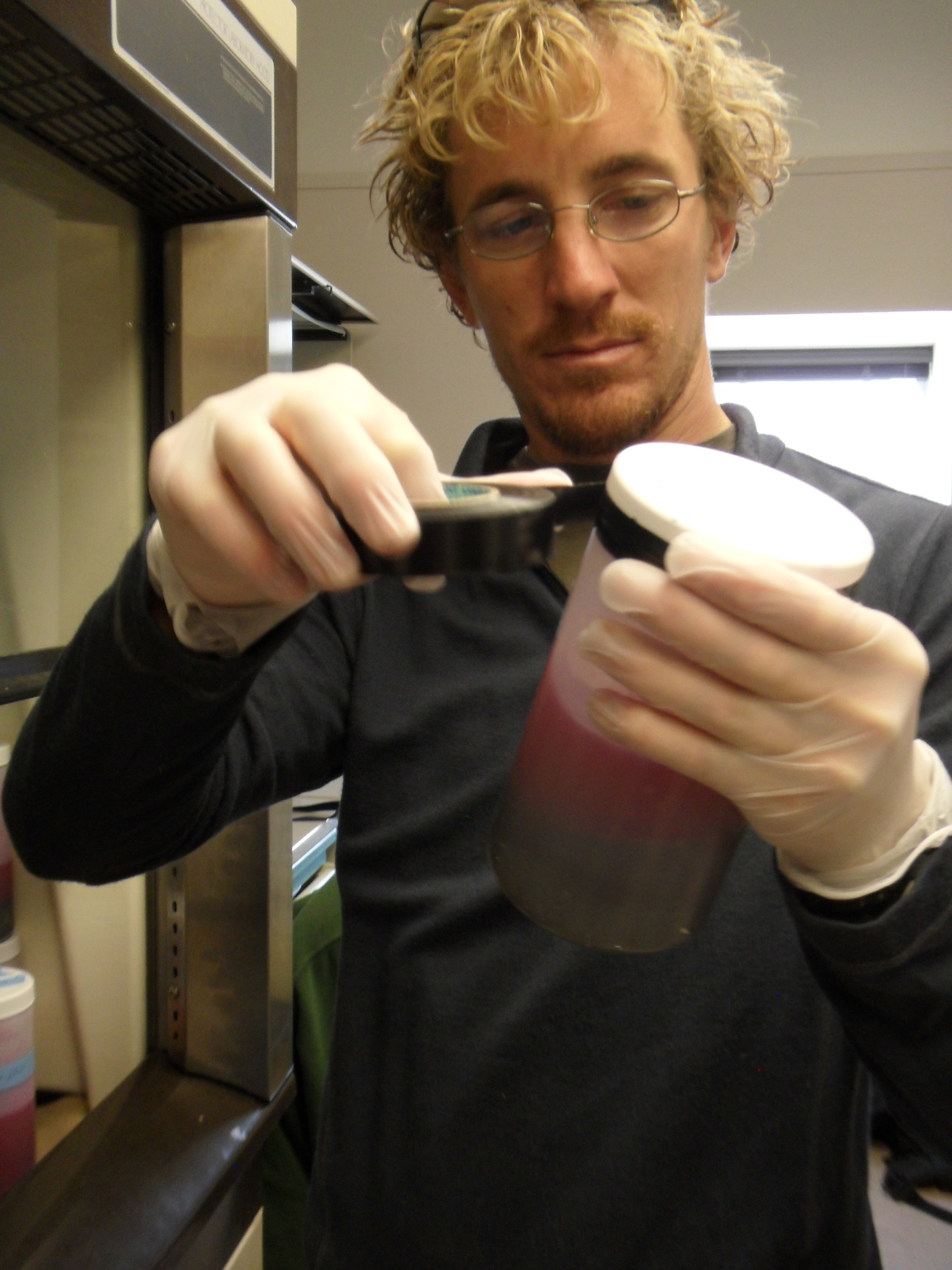 Terry Palmer seals sediment jars that have been stained pink to better identify organisms. McMurdo Station, Antarctica.
