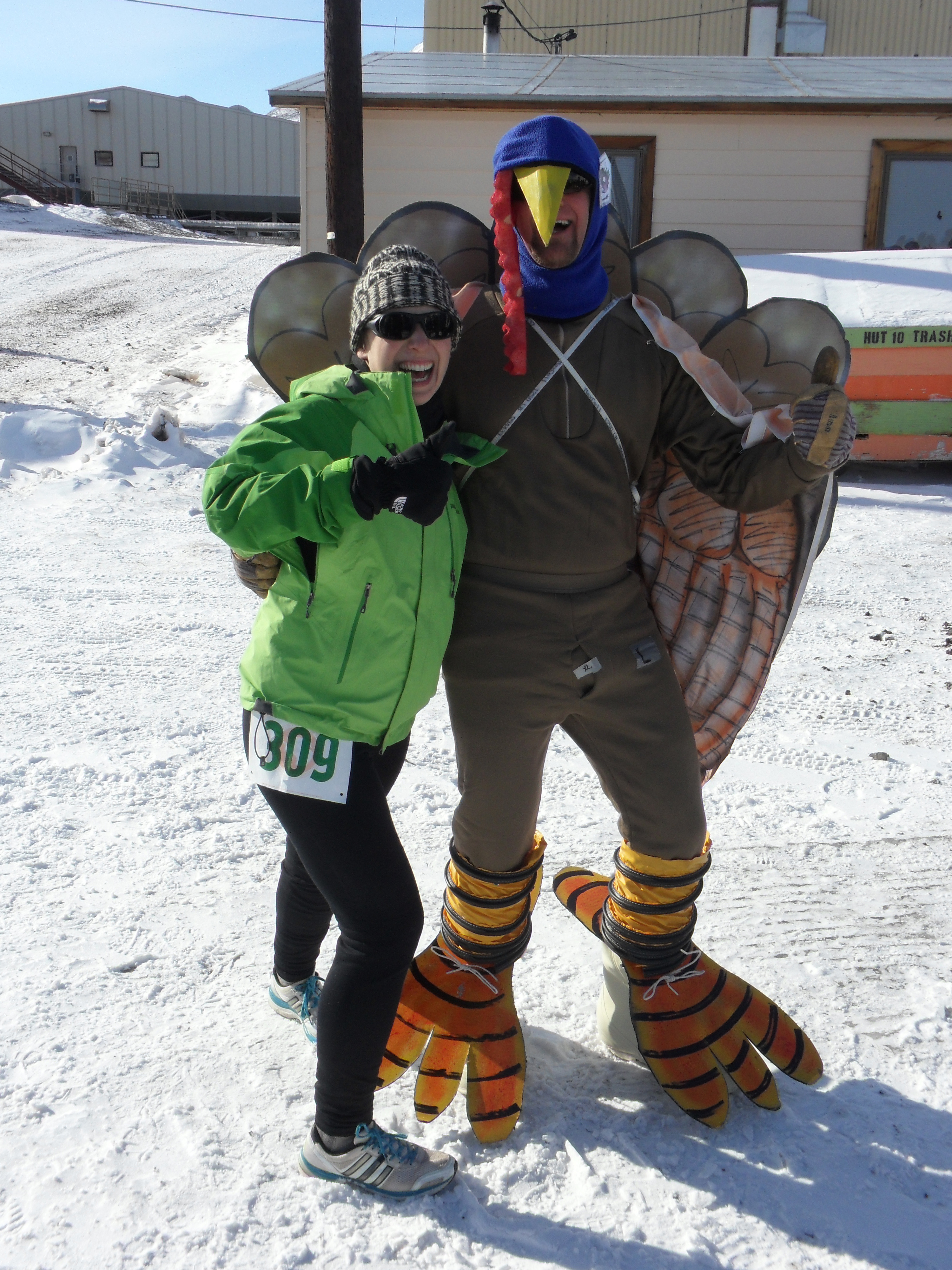 Michelle Brown poses with one of the Turkey Trot runners who helped found the Turkey Trot. McMurdo Station, Antarctica.