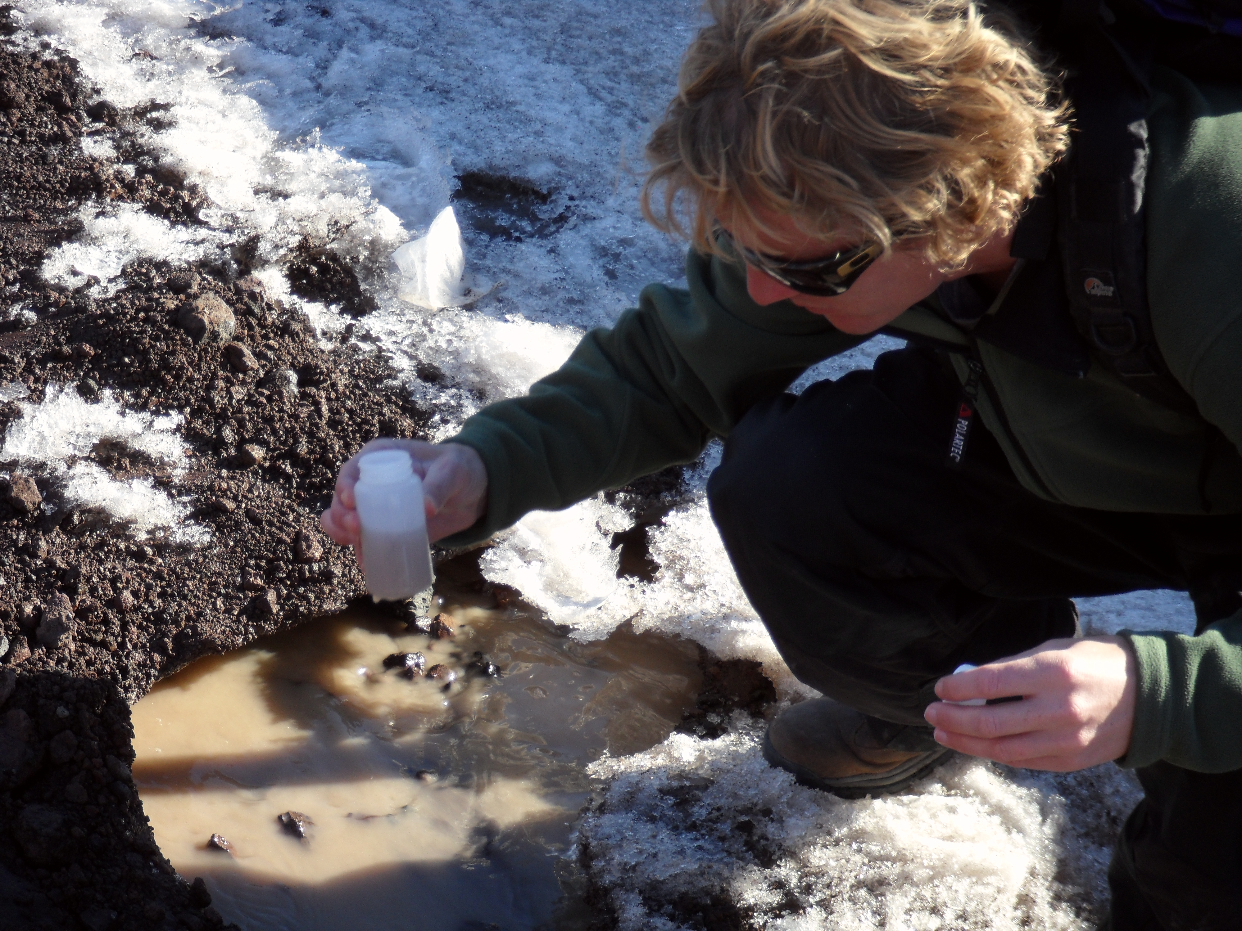 Terry Palmer collects water runoff at McMurdo Station in an effort to monitor the station's environmental health. McMurdo Station, Antarctica.