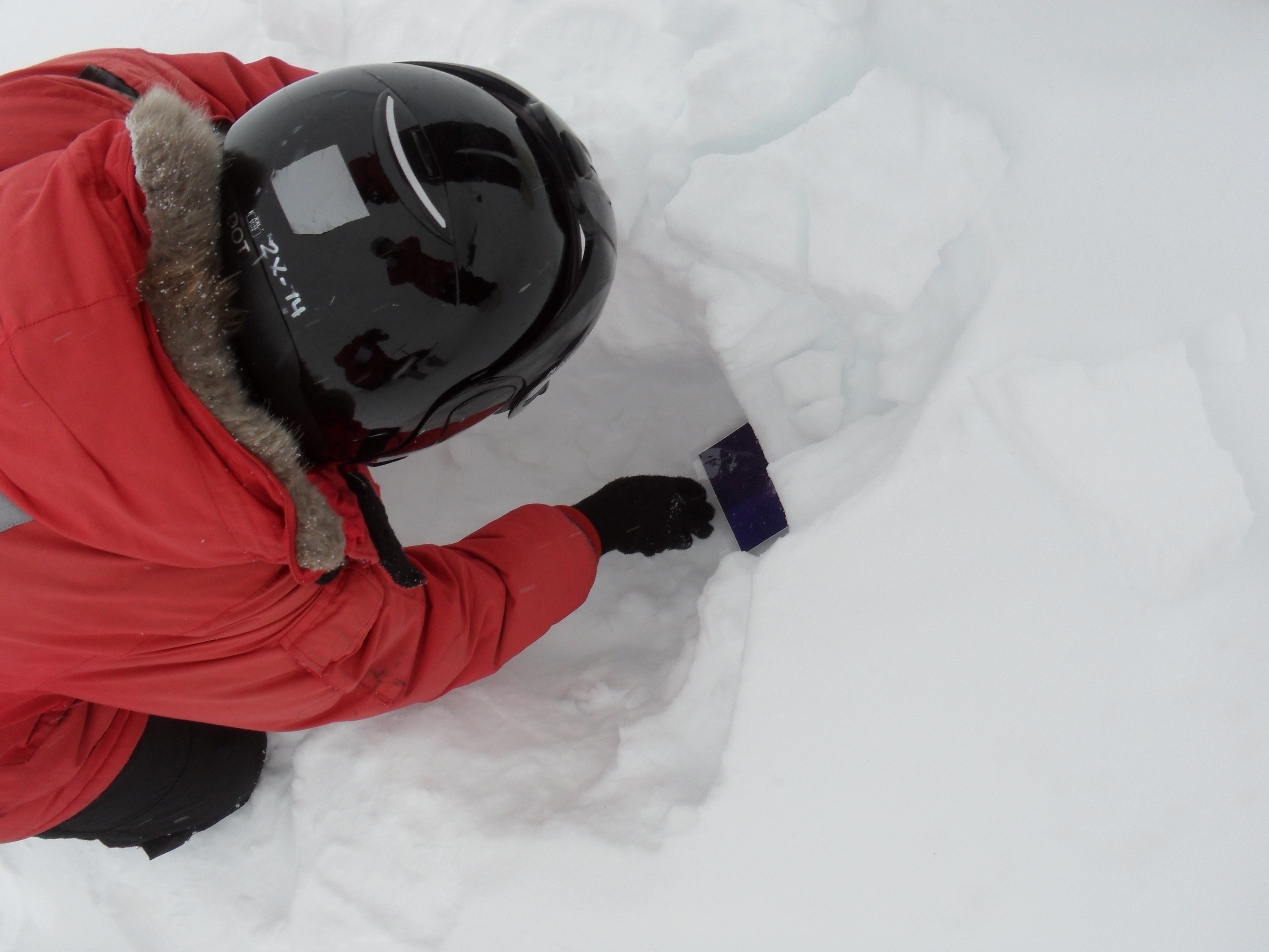 Joni Kincaid flicks snow onto the blue card and photographs it to measure the snow grain size. McMurdo Station, Antarctica.