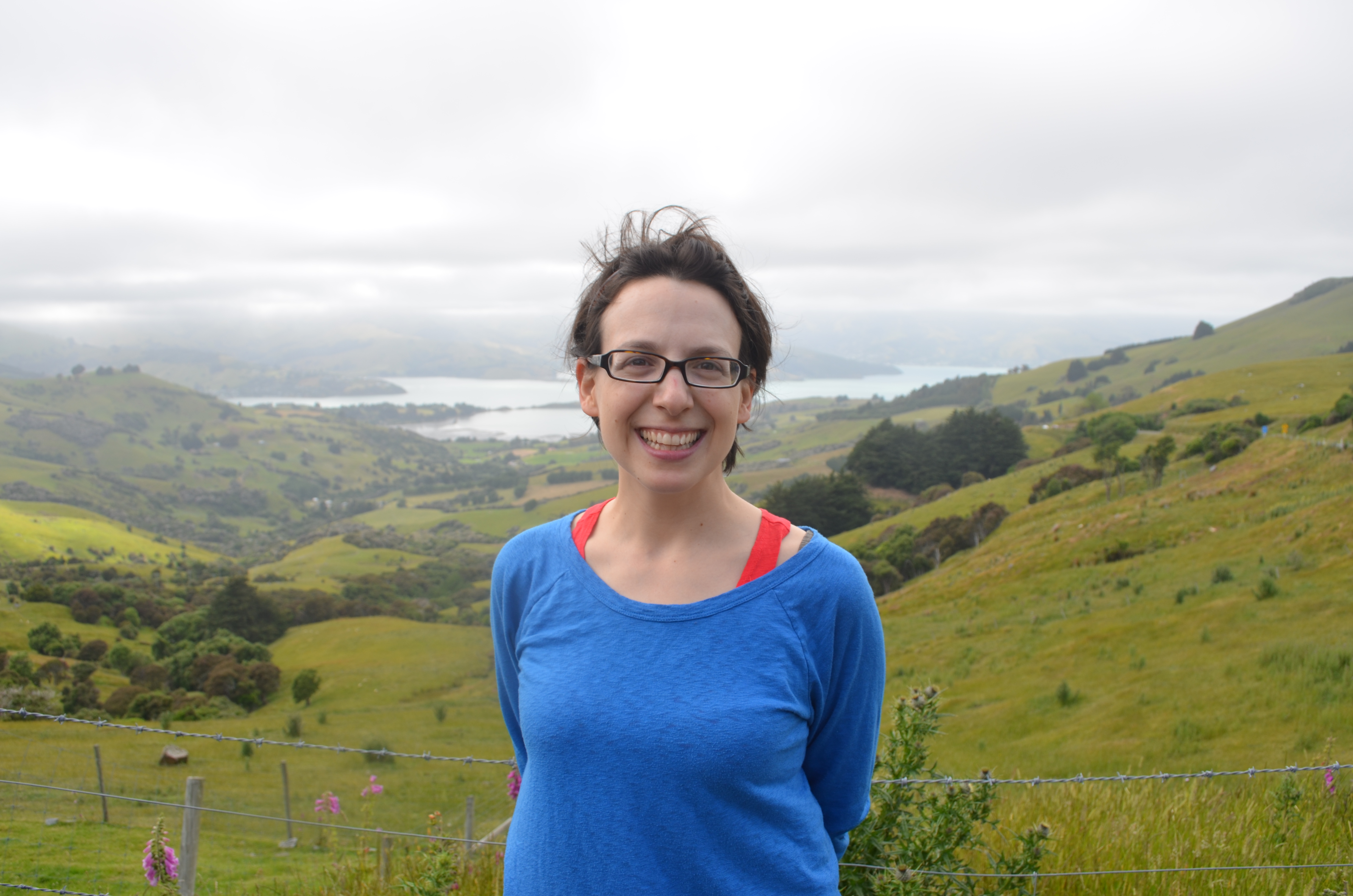 Michelle Brown stands at the top of the volcanoes, overlooking the harbor of Akaroa, New Zealand.
