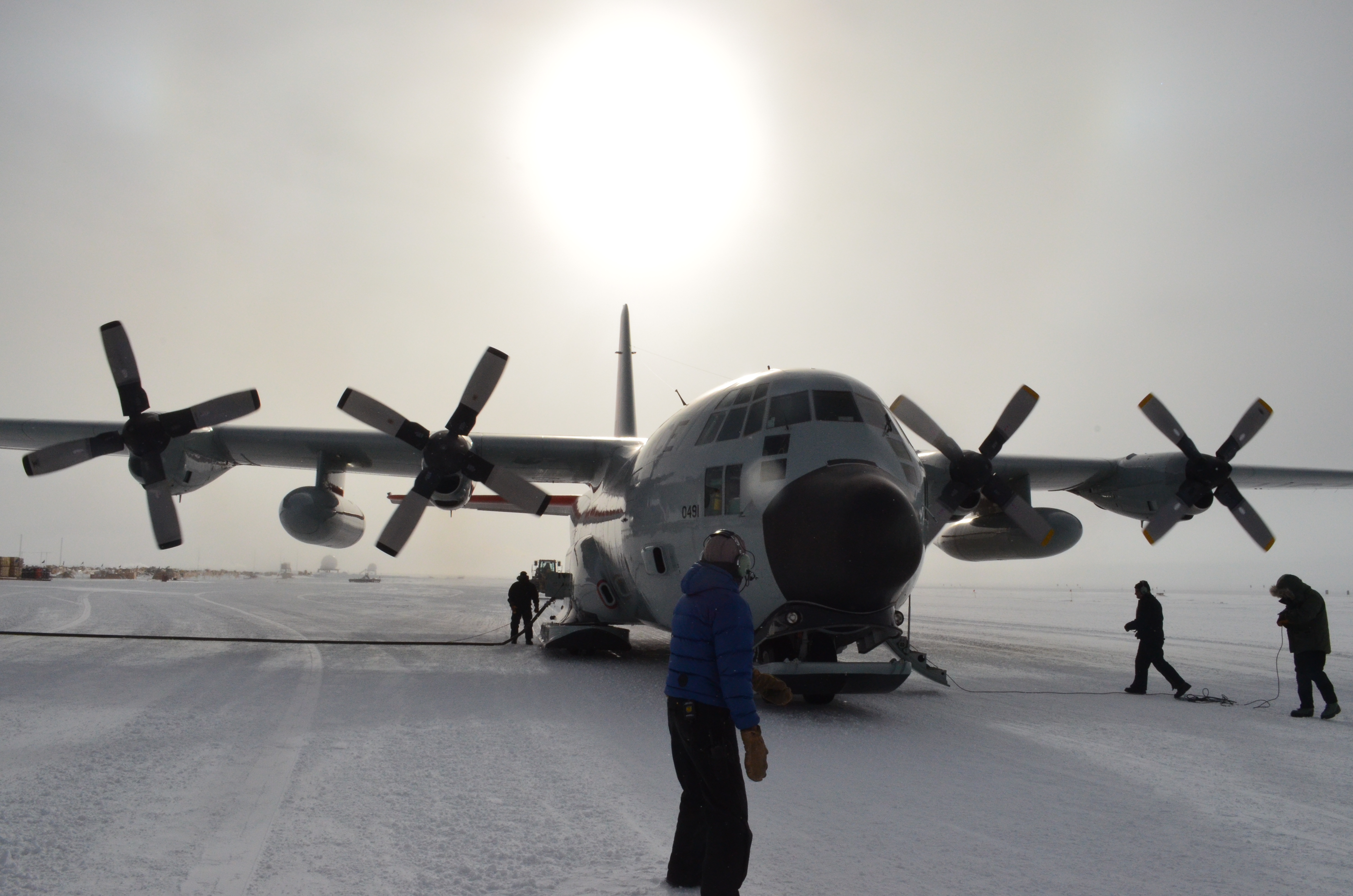 The LC-130 airplane lands on the ice runway at South Pole. The LC-130 has skis instead of wheels. Amundsen–Scott South Pole Station, Antarctica.