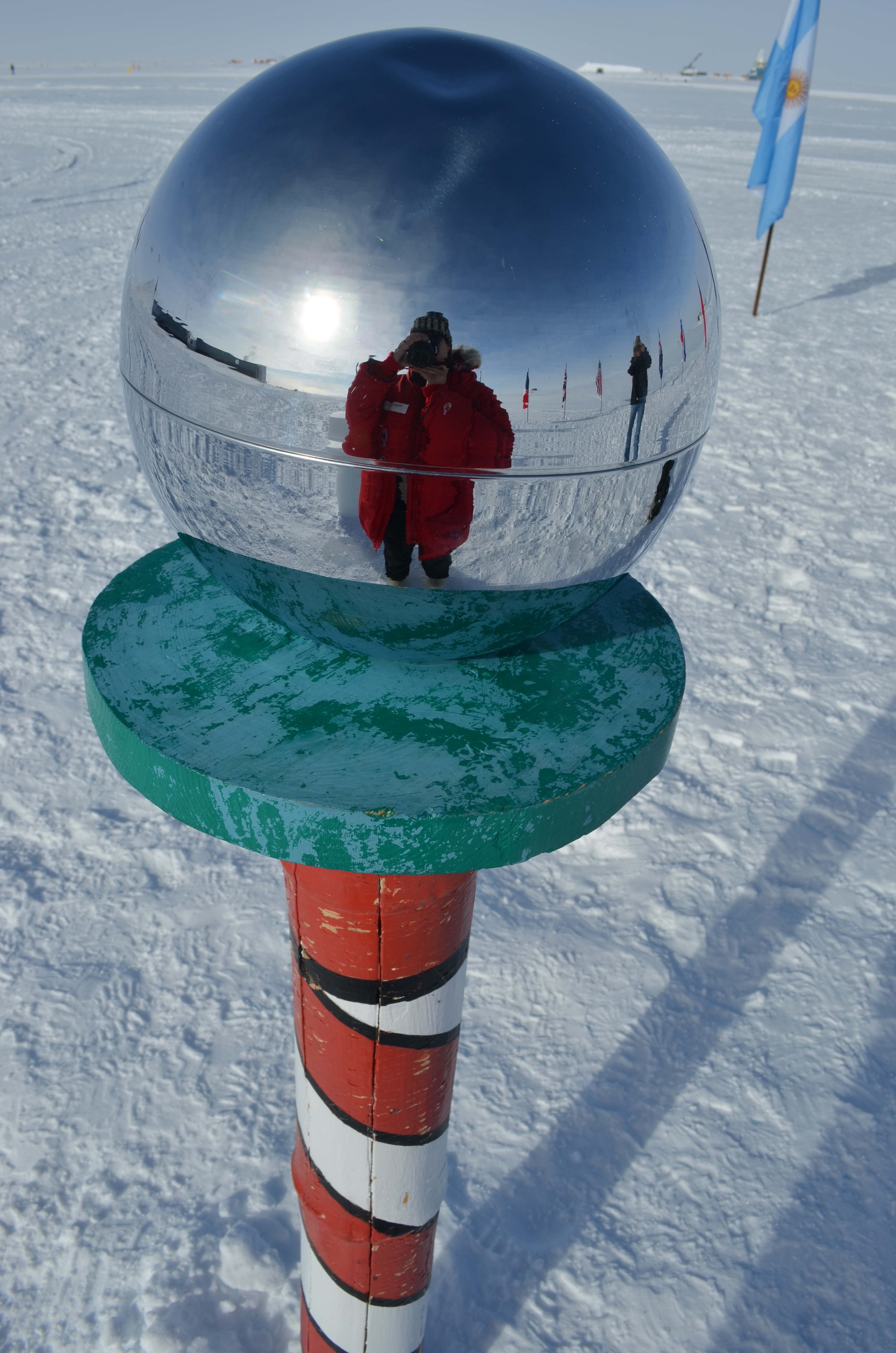 Michelle Brown's reflection can be see as she takes a photo of the Ceremonial South Pole. Amundsen–Scott South Pole Station, Antarctica.