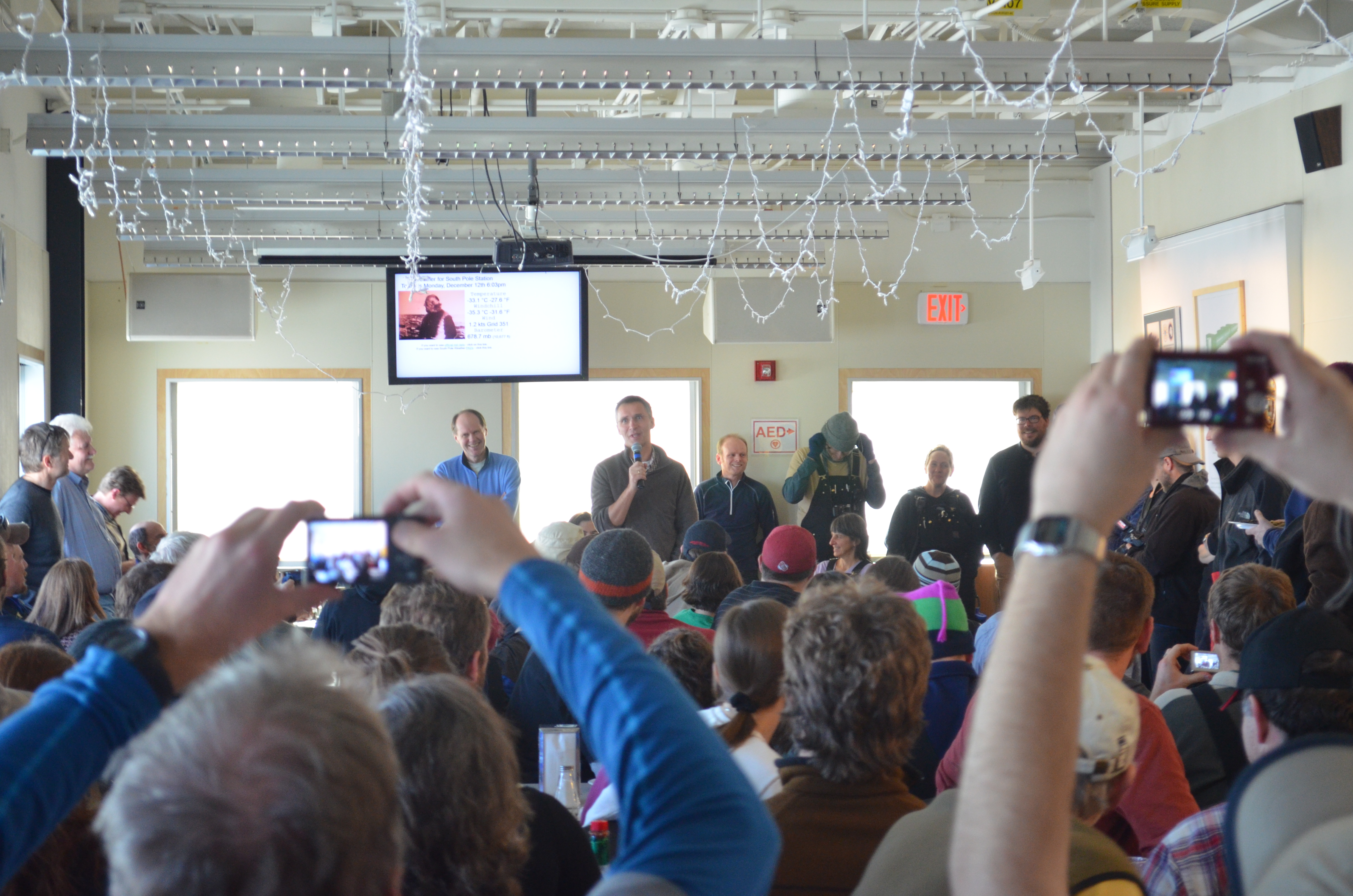 The Prime Minister of Norway, Jens Stoltenberg, speaks to people at the South Pole Station in the galley. Amundsen–Scott South Pole Station, Antarctica.