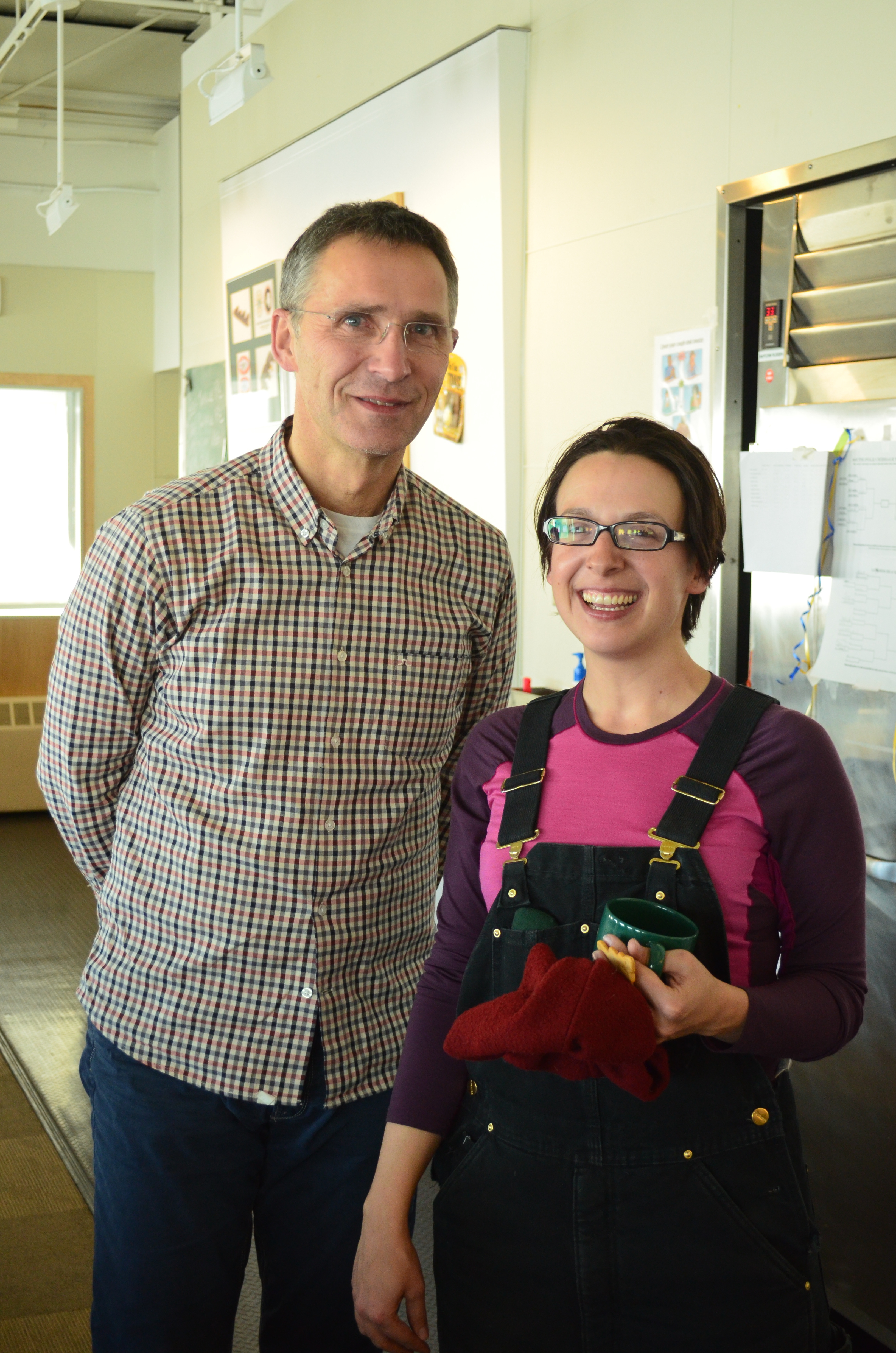 Prime Minister, Jens Stoltenberg, and Michelle Brown pose for a photo during a Norwegian celebration of glug and cookies. Amundsen–Scott South Pole Station, Antarctica.