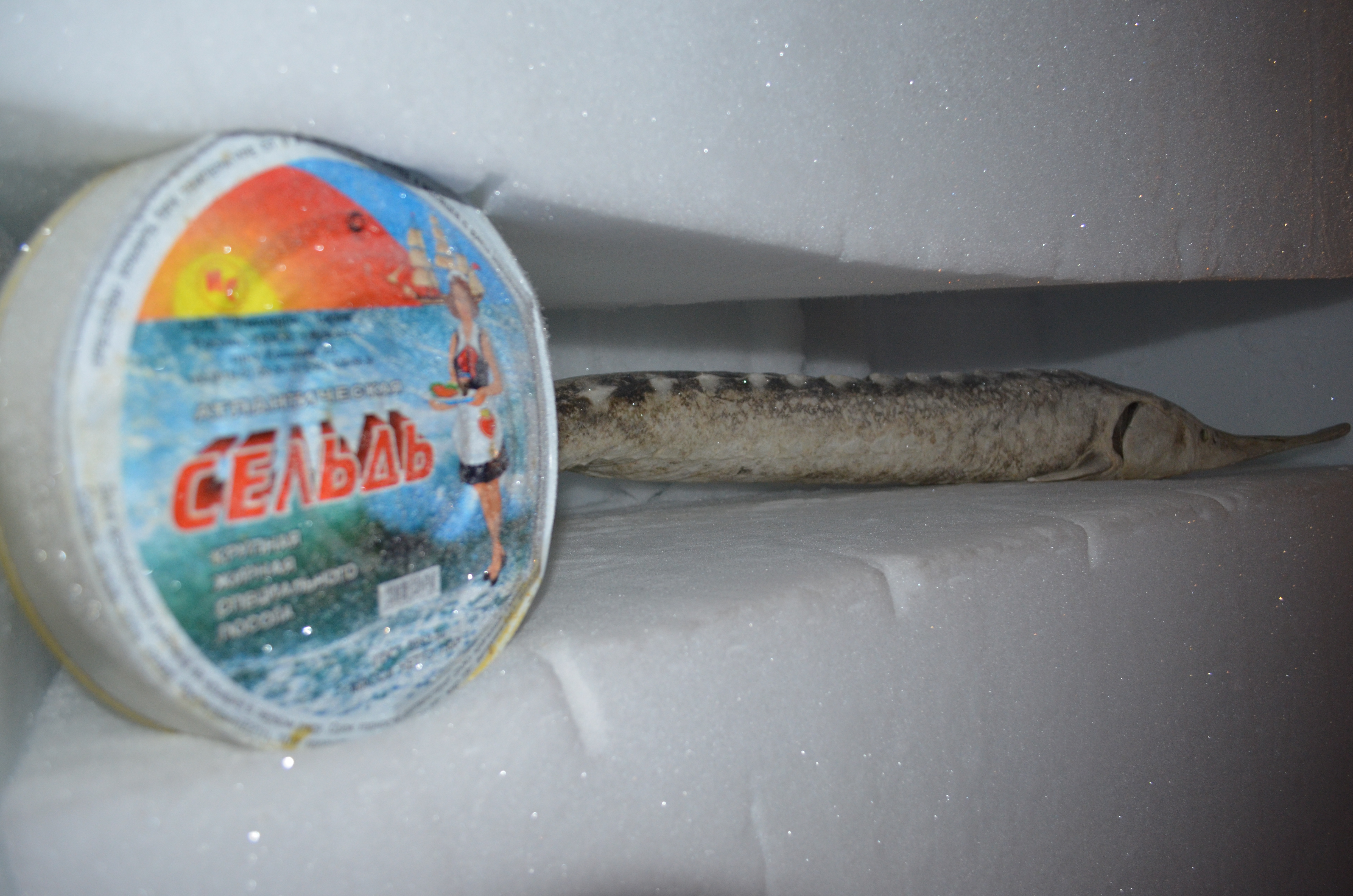 Michelle Brown: "A frozen sturgeon and can of food from Russia remain frozen in the ice tunnel." Amundsen–Scott South Pole Station, Antarctica.