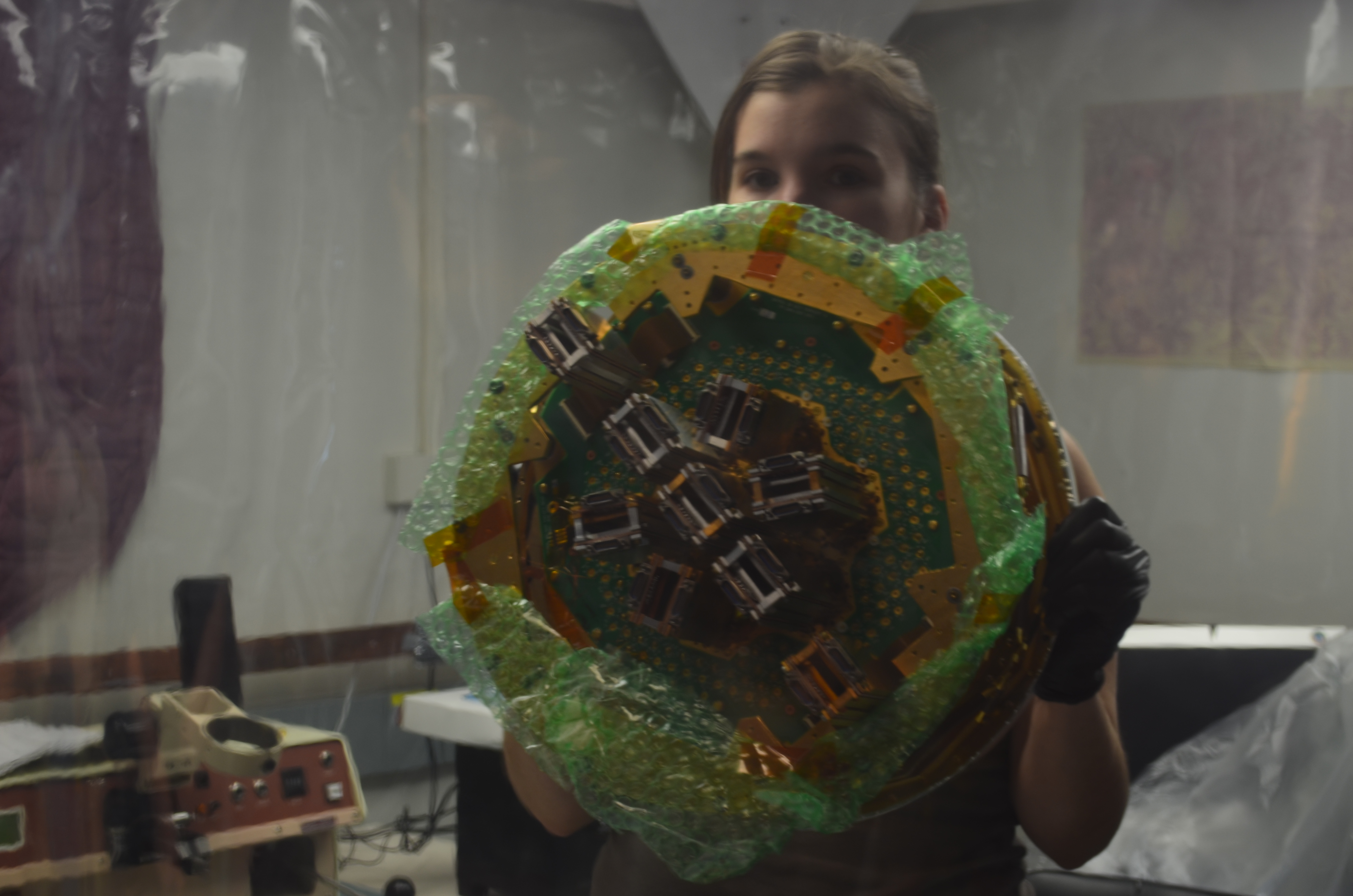 A South Pole Telescope researcher holds up a section of the microchips that record the cosmic microwaves. Amundsen–Scott South Pole Station, Antarctica.