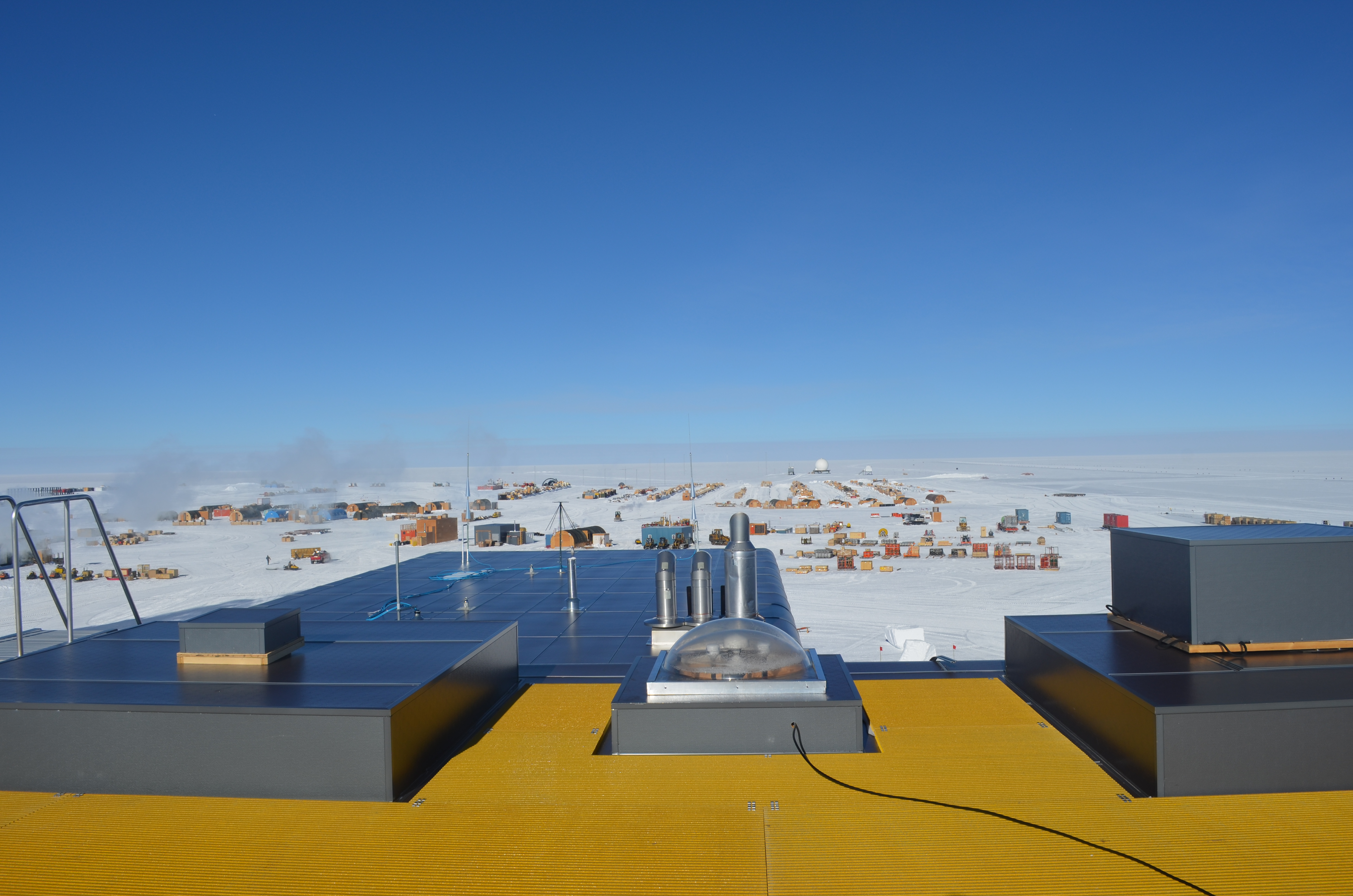 Michelle Brown: "A view from the roof where Rolf Hertenstein makes weather observations. Notice the lines of cargo and Jamesways in the background." Amundsen–Scott South Pole Station, Antarctica.