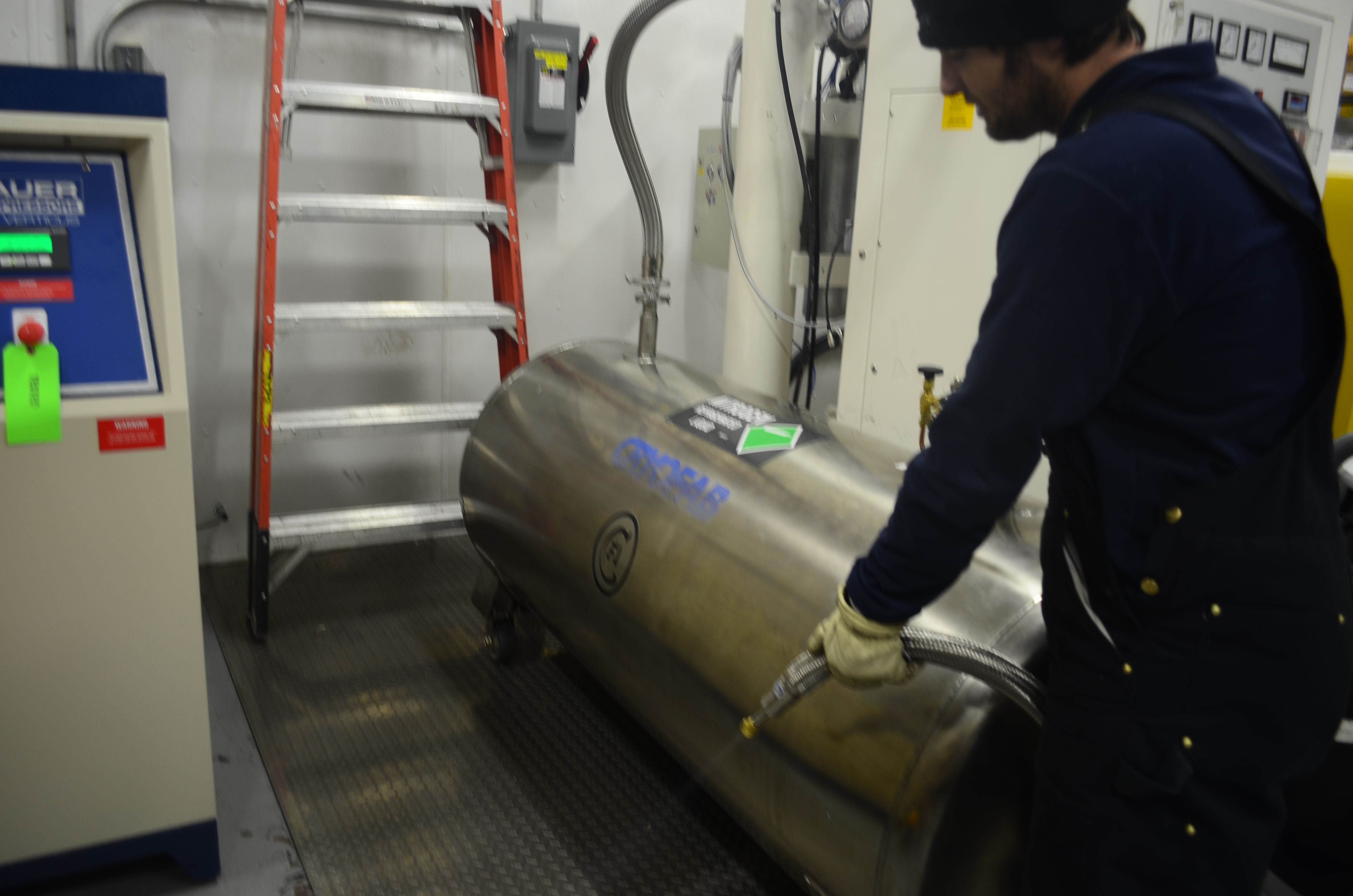 Flint shows Michelle Brown the compressed liquid nitrogen at the cryogenics facility. Amundsen–Scott South Pole Station, Antarctica.