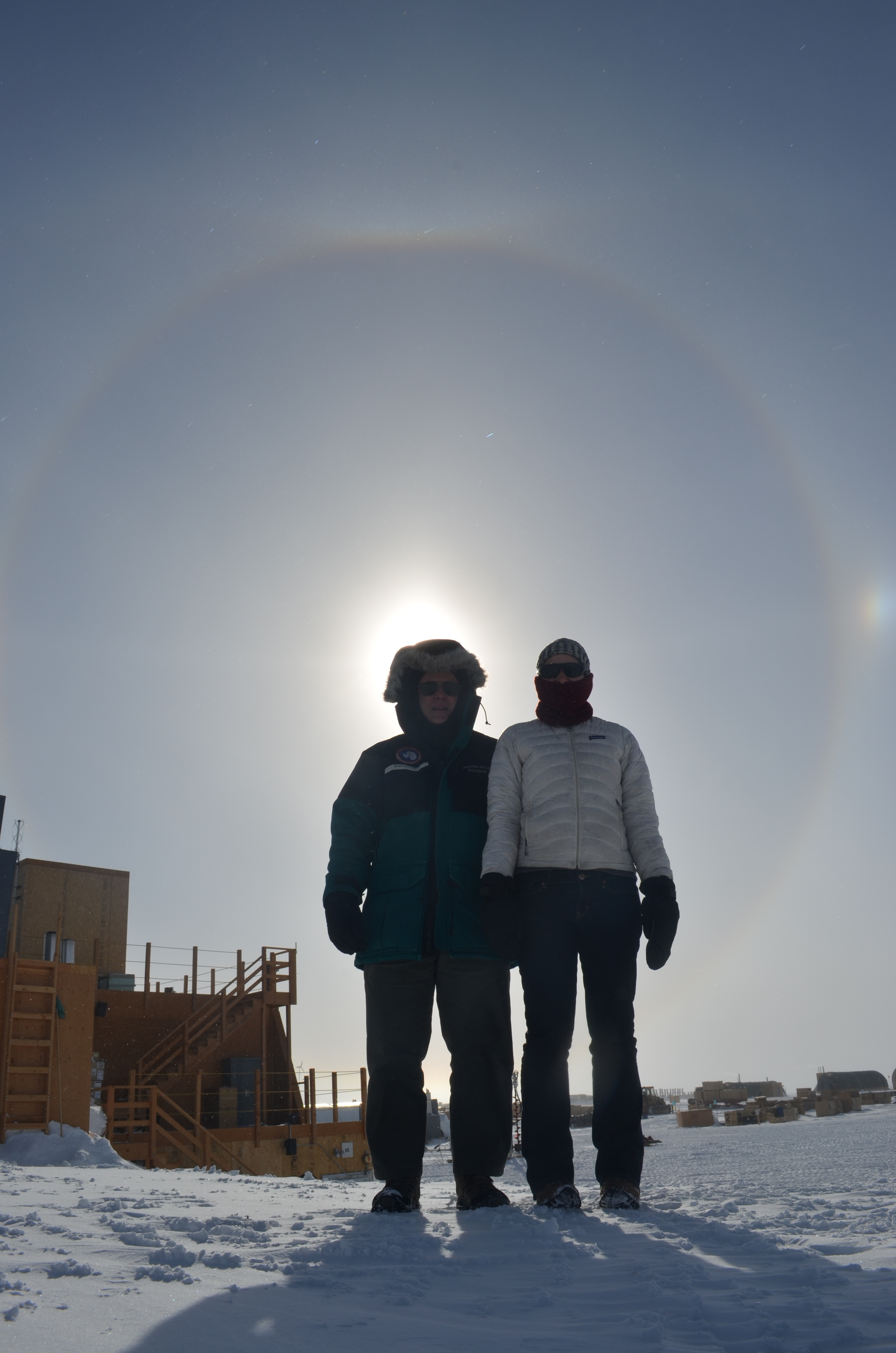 Bob Melville and Michelle Brown stand in front of a sun dog and halo. Amundsen–Scott South Pole Station, Antarctica.