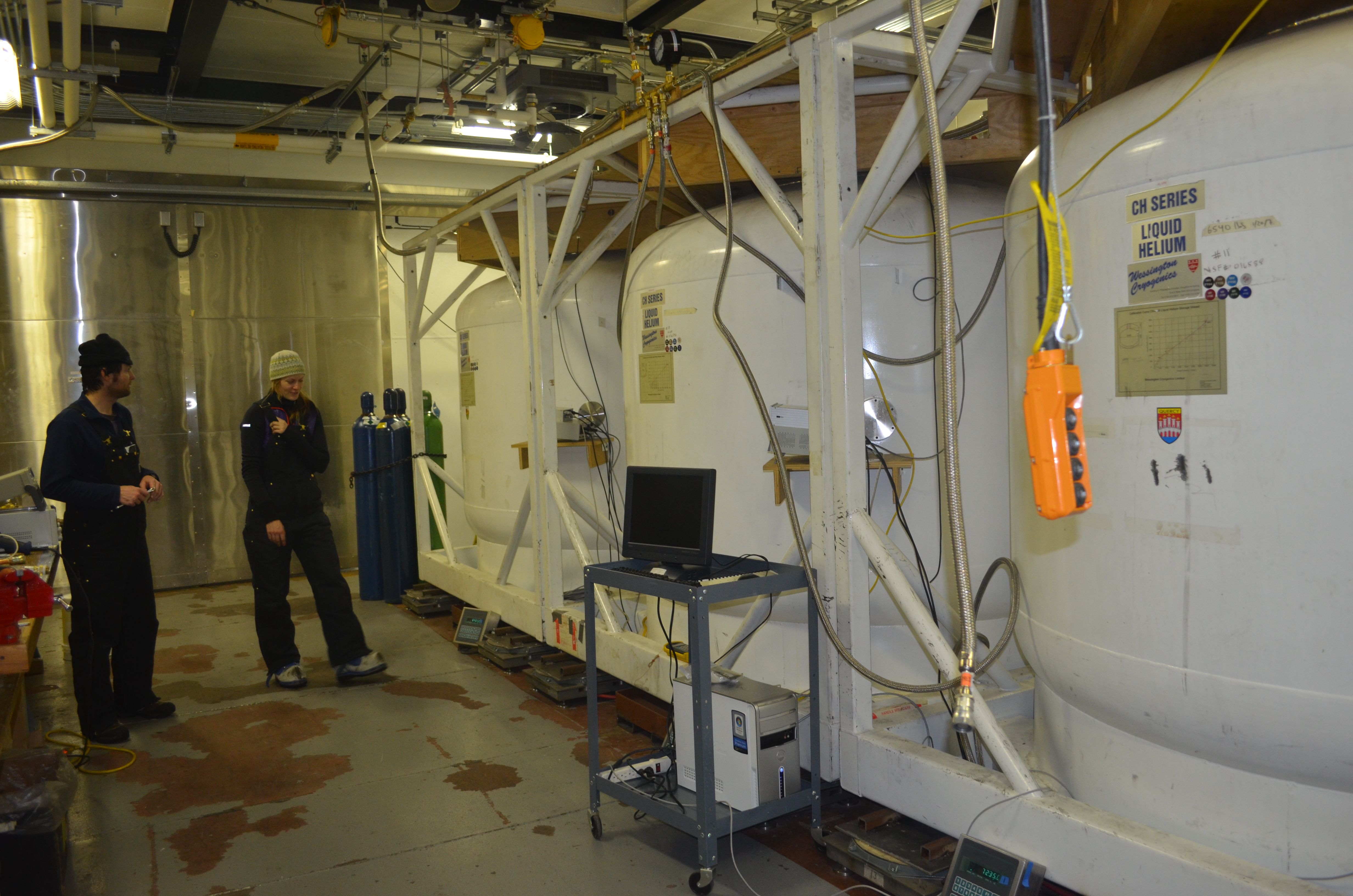 Three giant dewars can hold up to 12,000 to 18,000 liters of liquid helium. Amundsen–Scott South Pole Station, Antarctica.