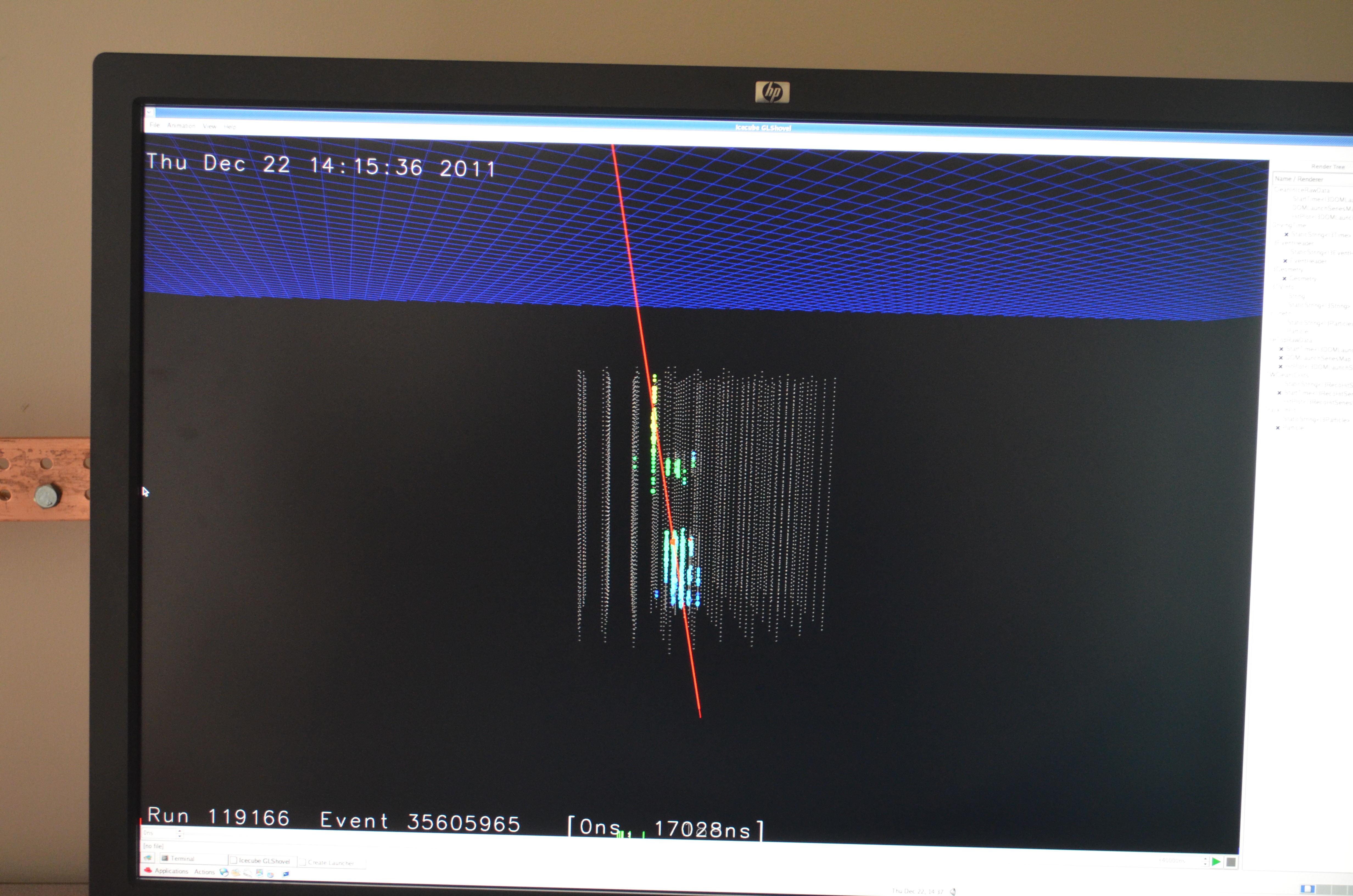 A computer screen shows an event recorded by one of the Digital Optical Modules (DOMs). Like many of the recorded events, this one comes from above the ice so it is unsure if it is a neutrino. Amundsen–Scott South Pole Station, Antarctica.