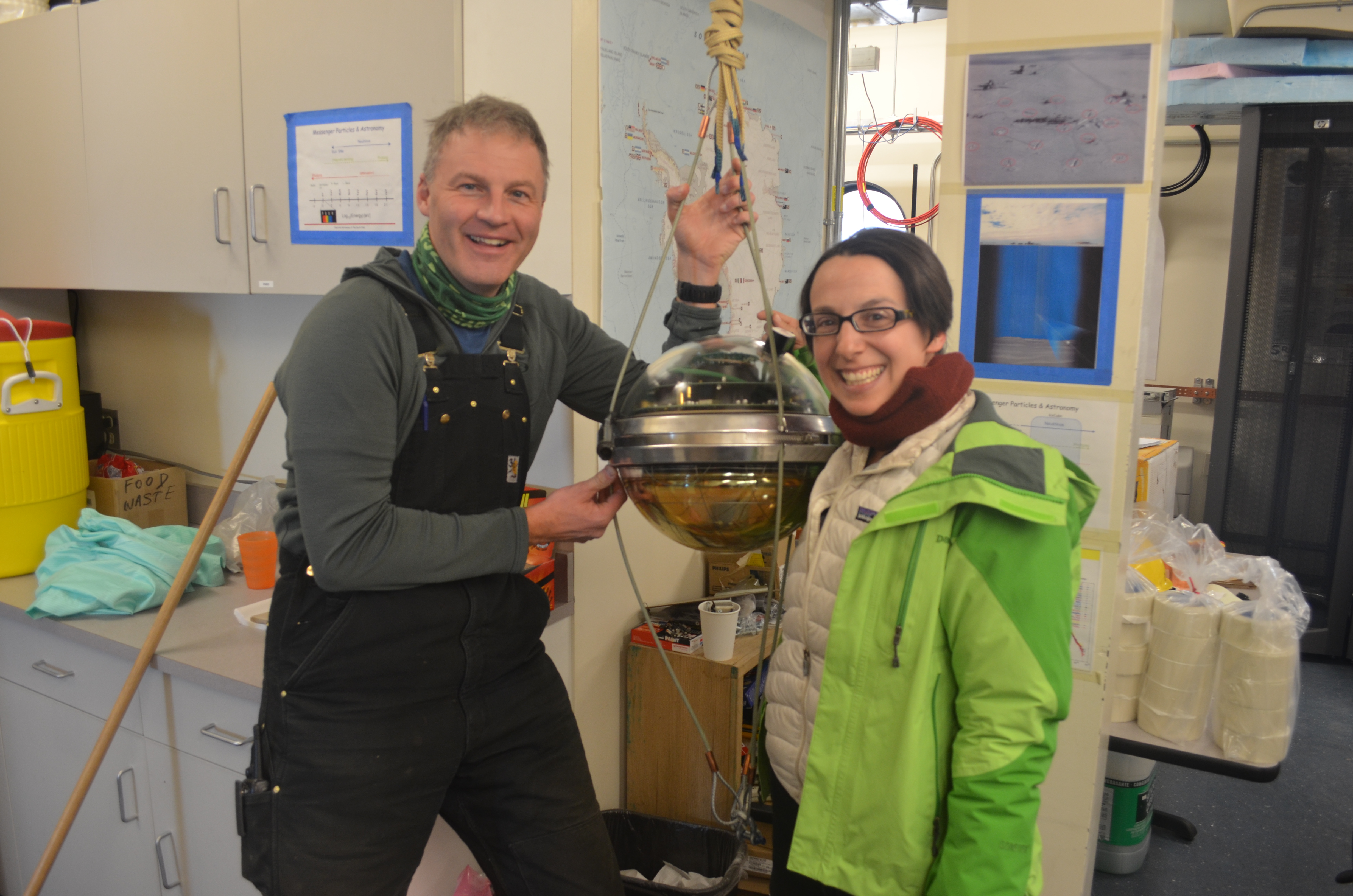 Sven Lidstrom and Michelle Brown pose by an example of a Digital Optical Module (DOM), which records neutrinos in the ice. Amundsen–Scott South Pole Station, Antarctica.