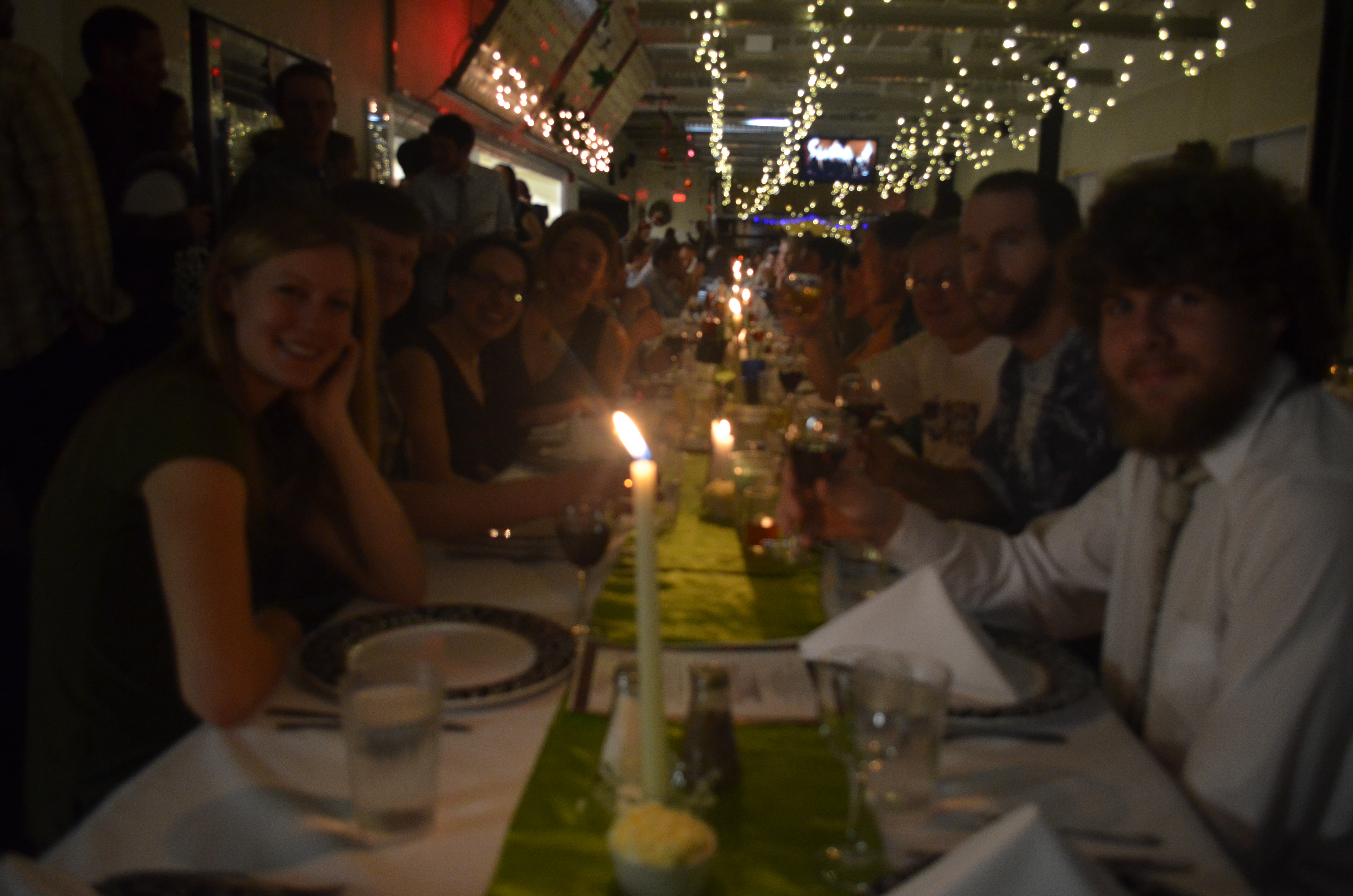The AGO team sits together for a Christmas Eve dinner. Amundsen–Scott South Pole Station, Antarctica.