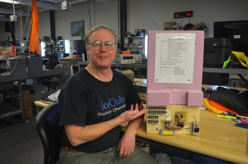 Bob Melville is one of the engineers that Michelle Brown has been working with at the AGO. Bob sits next to his telemetry system which he built. Amundsen–Scott South Pole Station, Antarctica.