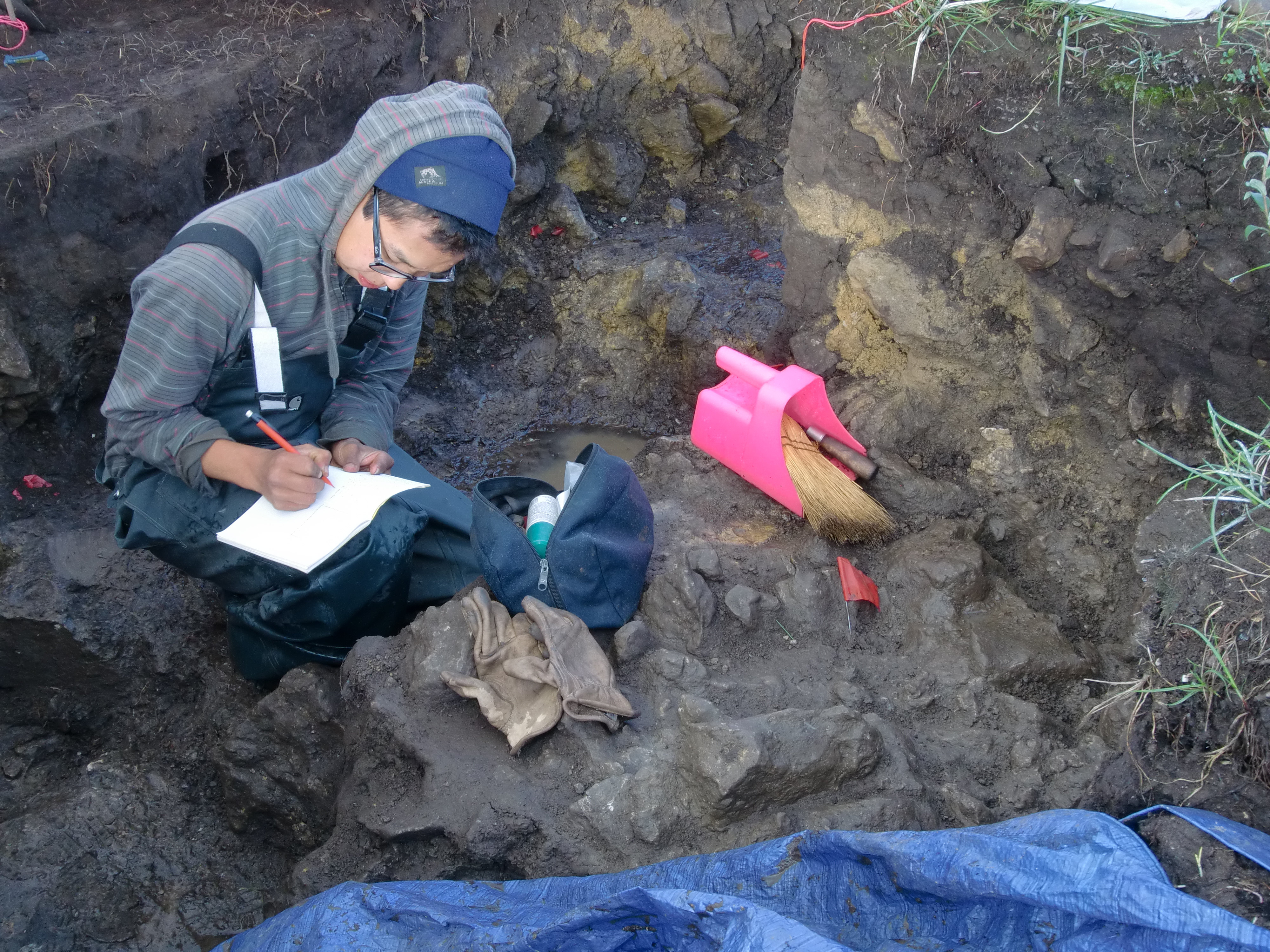Tim uses traditional archaeological tools – a notebook, pencil, whisk broom, flagging, and a trowel. The colored sandbox scoop is a new innovation, replacing a dustpan. At Raven Bluff, near Kivalina, Alaska.