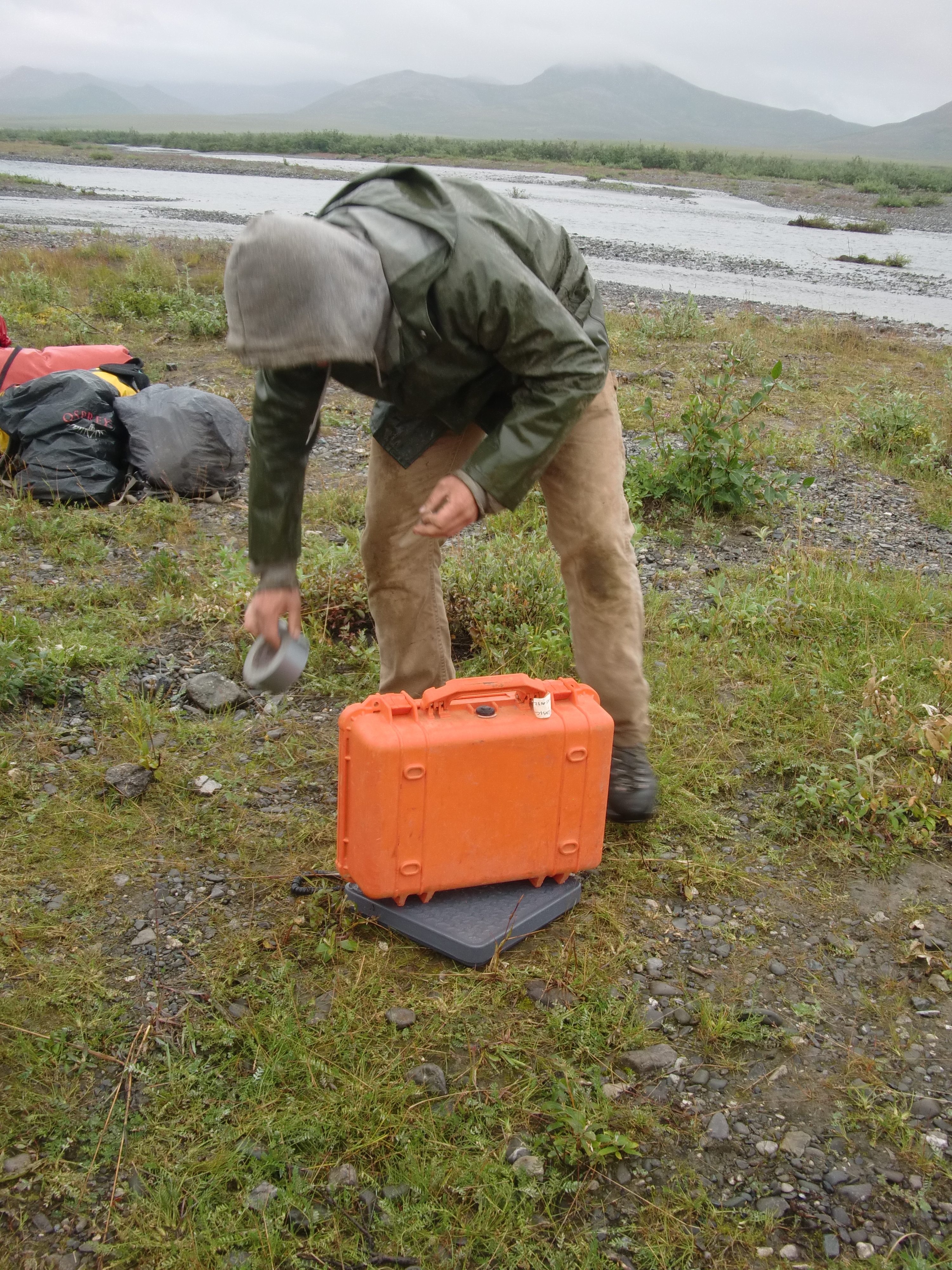 Each piece of equipment had to be weighed on a digital scale. The weight was recorded on a piece of duct tape so that the team we could calculate the weight of the loads for the helicopter. At Raven Bluff, near Kivalina, Alaska.