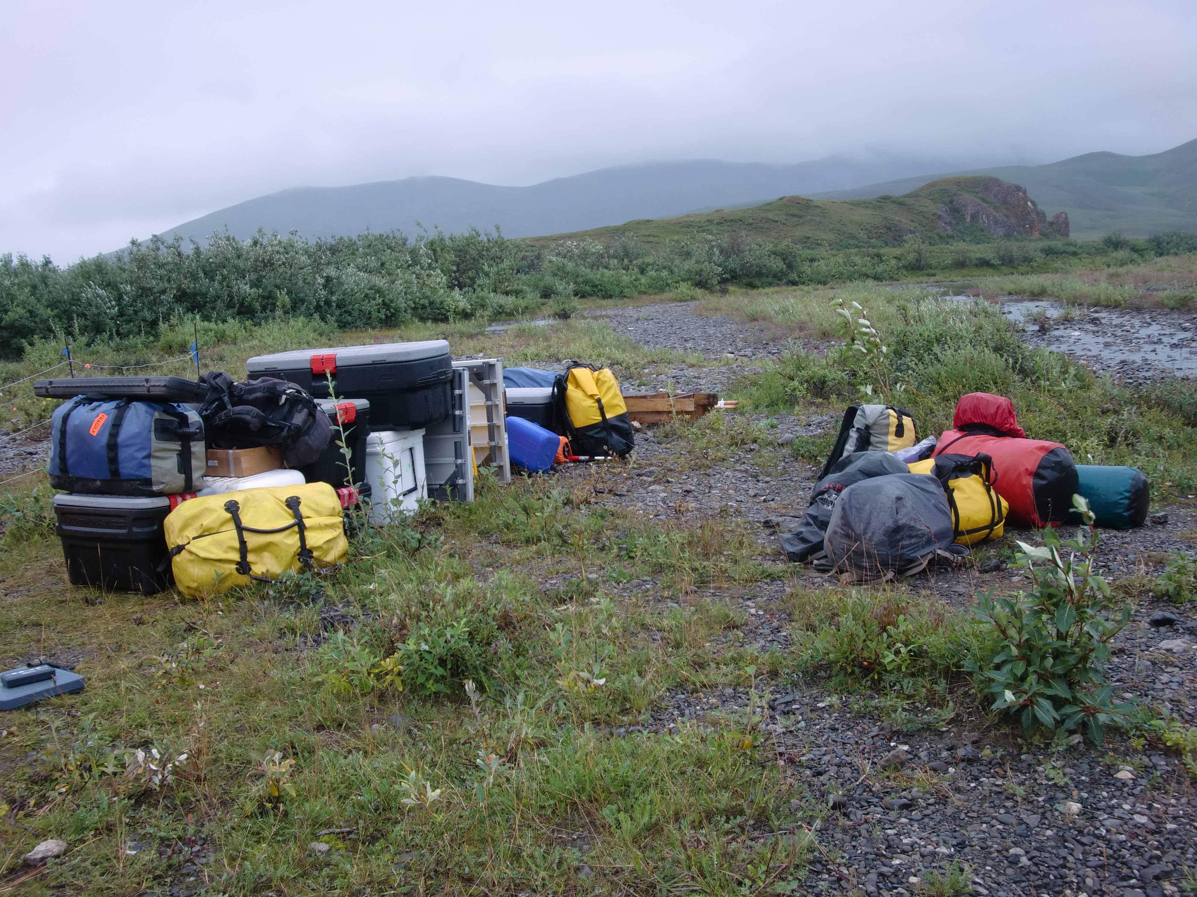 Susy Ellison: "We were glad we had taken the time last night to pack away all the stuff -- the morning was pretty wet. Here's our pile of gear that would be flown to the Red Dog Mine by helicopter." At Raven Bluff, near Kivalina, Alaska.