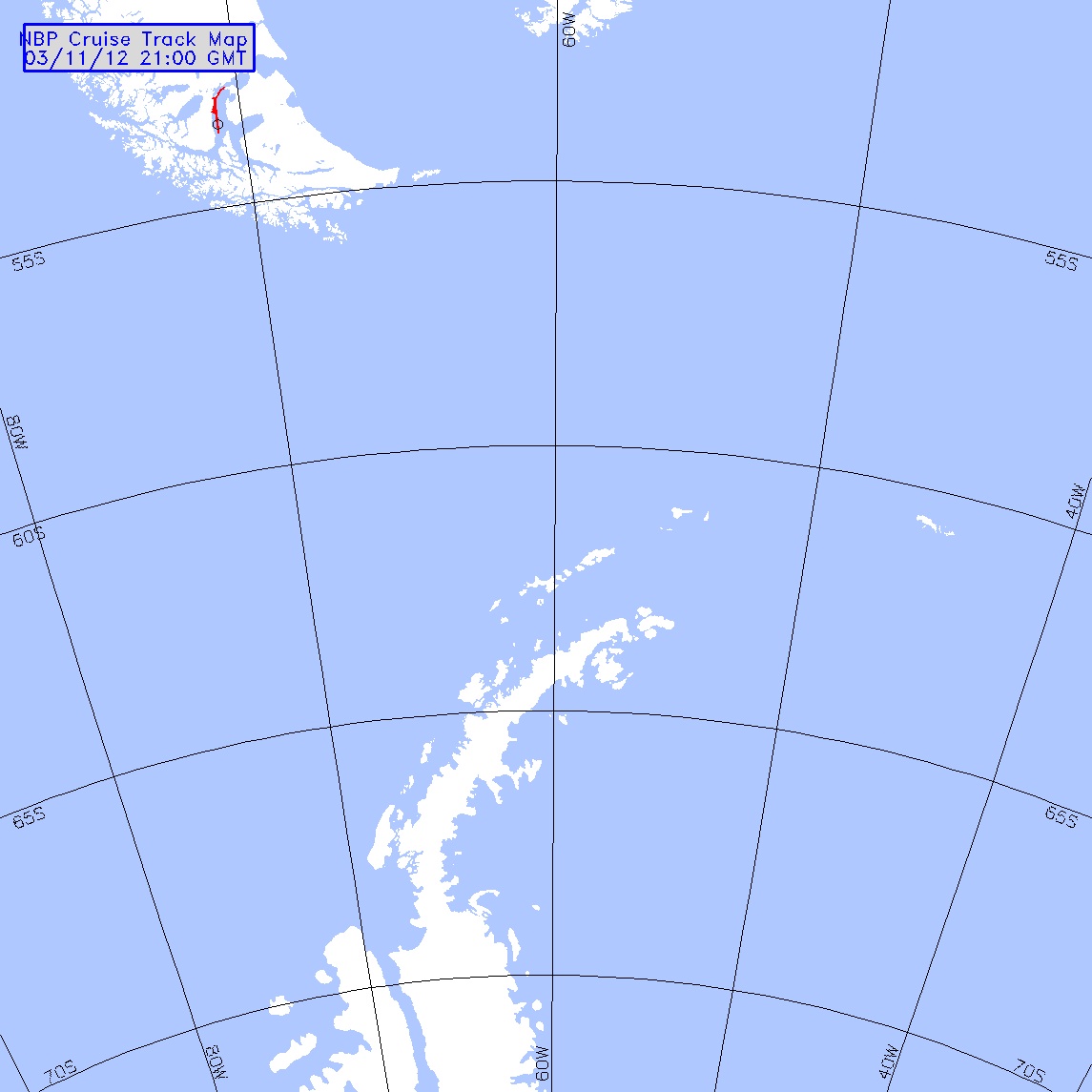 A map showing the route of the Nathaniel B. Palmer as of 3/11/2012, heading out through the Strait of Magellan. Aboard the Nathaniel B. Palmer icebreaker in the Strait of Magellan, Chile.