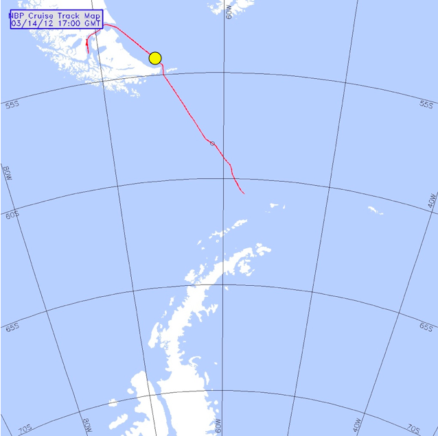 Map of the route of the Nathaniel B. Palmer as of 3/14/2012. The yellow dot is an approximate location of a dolphin sighting. Aboard the Nathaniel B. Palmer icebreaker in the Drake Passage near Antarctica.