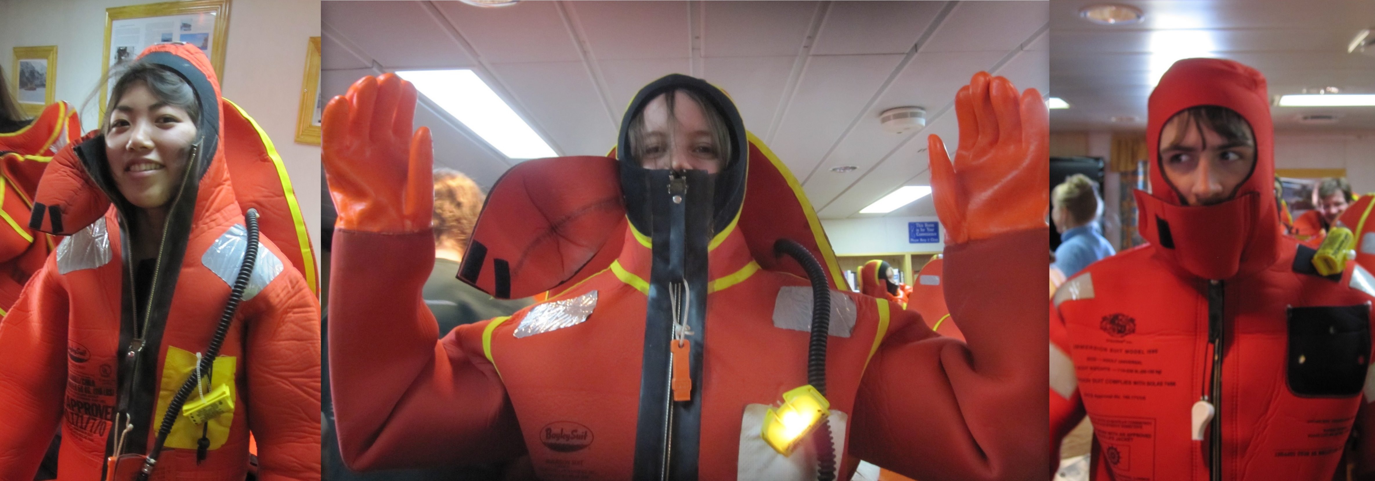 Megumi Shimizu, Amber Lancaster, and Jameson Clarke try on our immersible Gumby suits. Aboard the Nathaniel B. Palmer icebreaker in at the port of Punta Arenas, Chile.