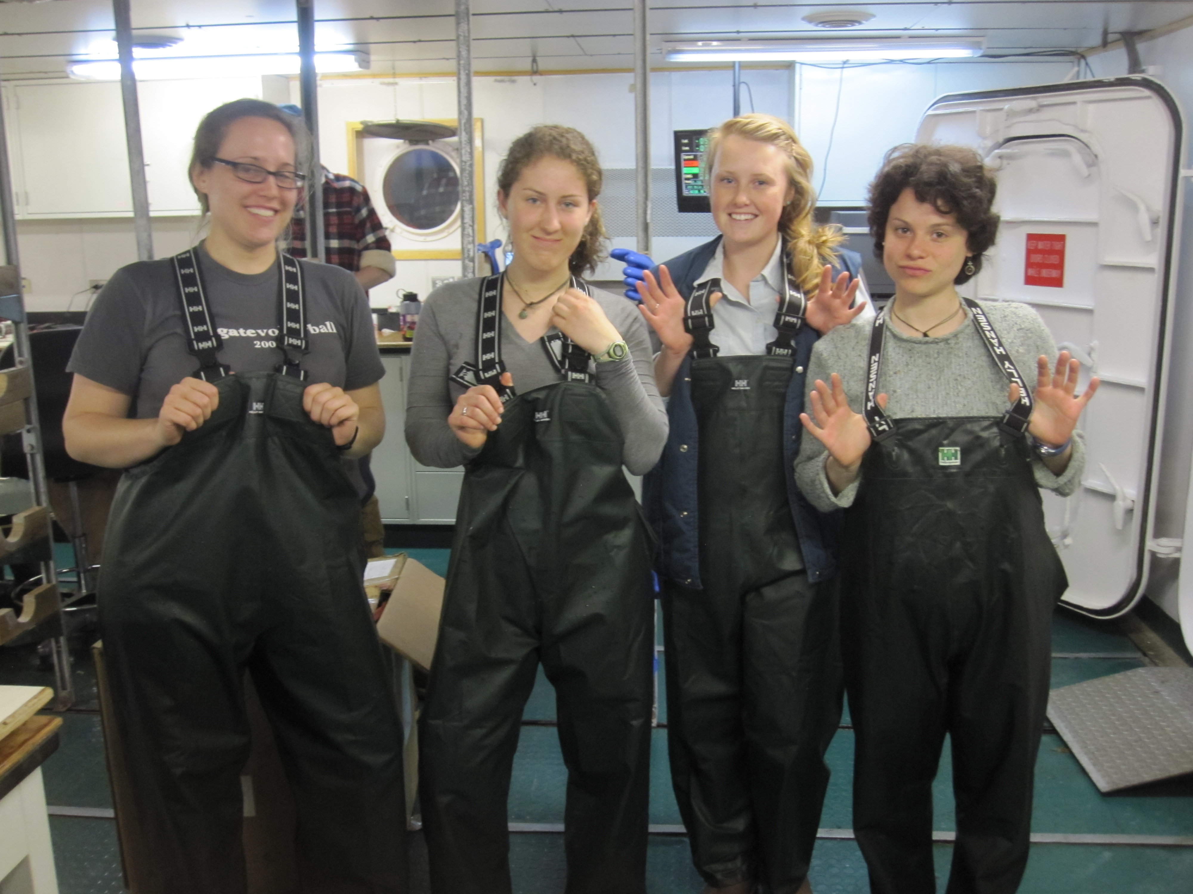 Left to right: Ilona Matulaitis, Kara Vadman, Natalie Elking, and Manique Talaia-Murray. Aboard the Nathaniel B. Palmer icebreaker in the Strait of Magellan, Chile.