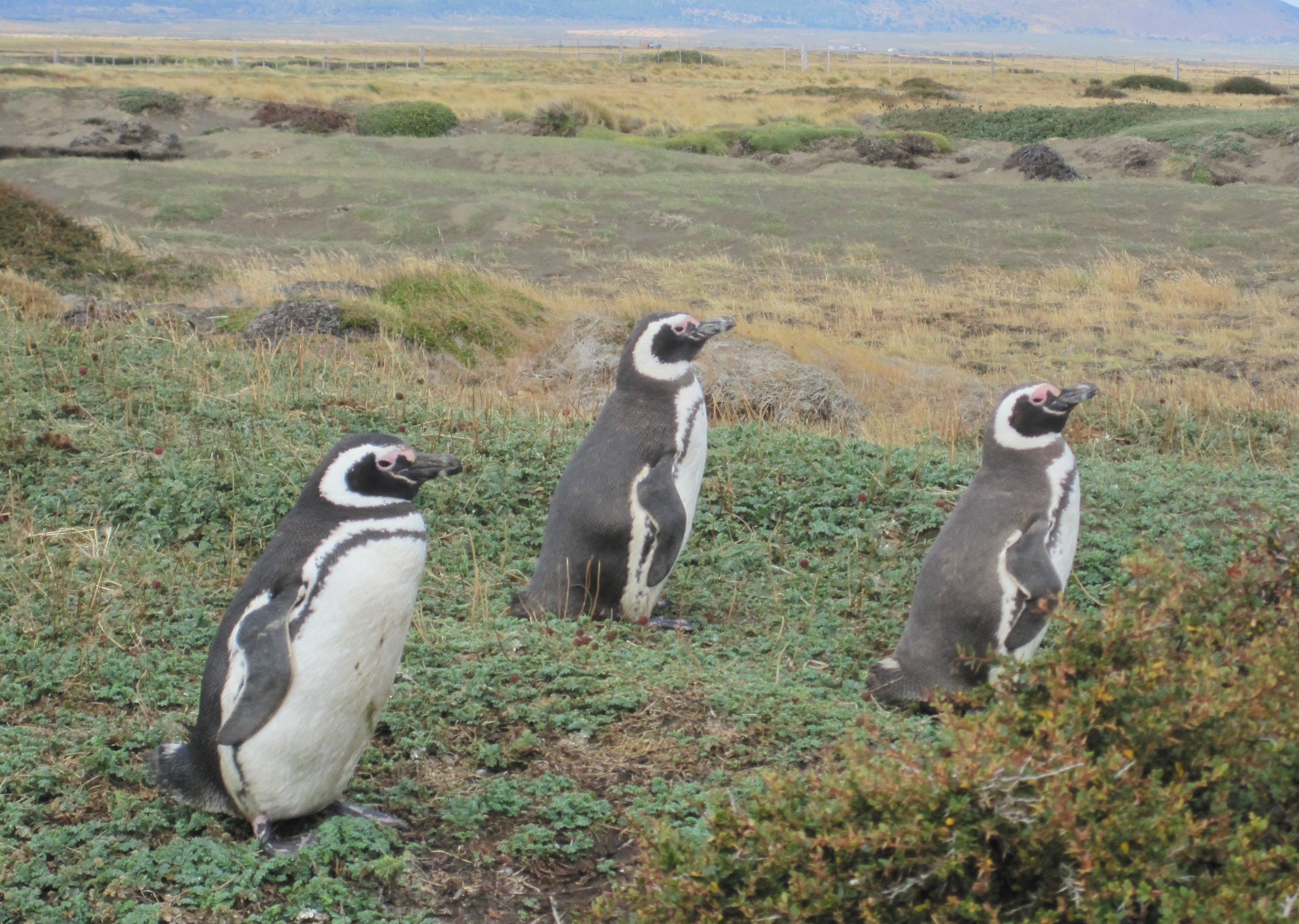 Three Magellanic Penguins pose for a photo. Seno Otway, Chile.