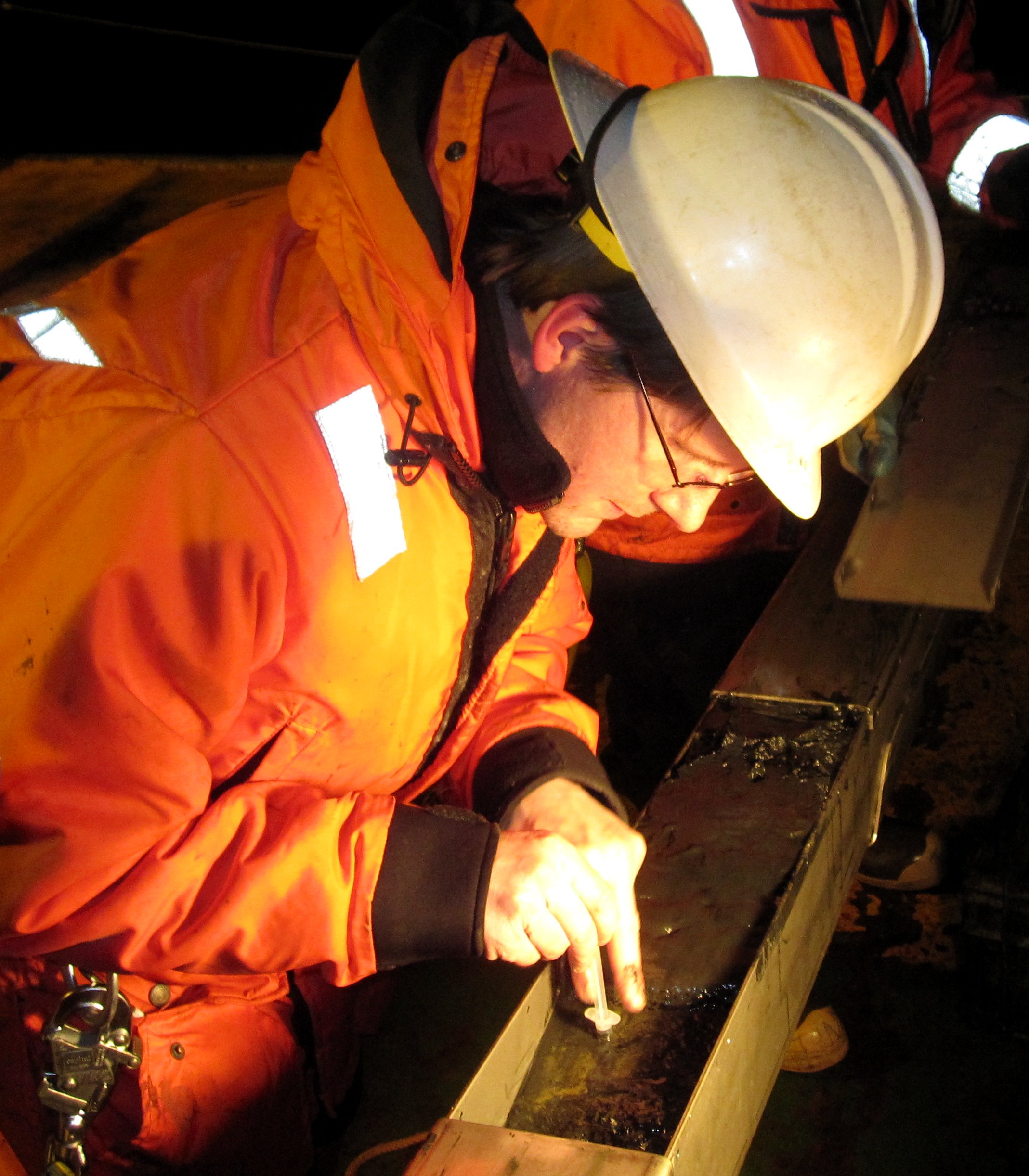 Michael McCormick takes Kasten core samples. Aboard the Nathaniel B. Palmer icebreaker in the Weddell Sea, Antarctica.