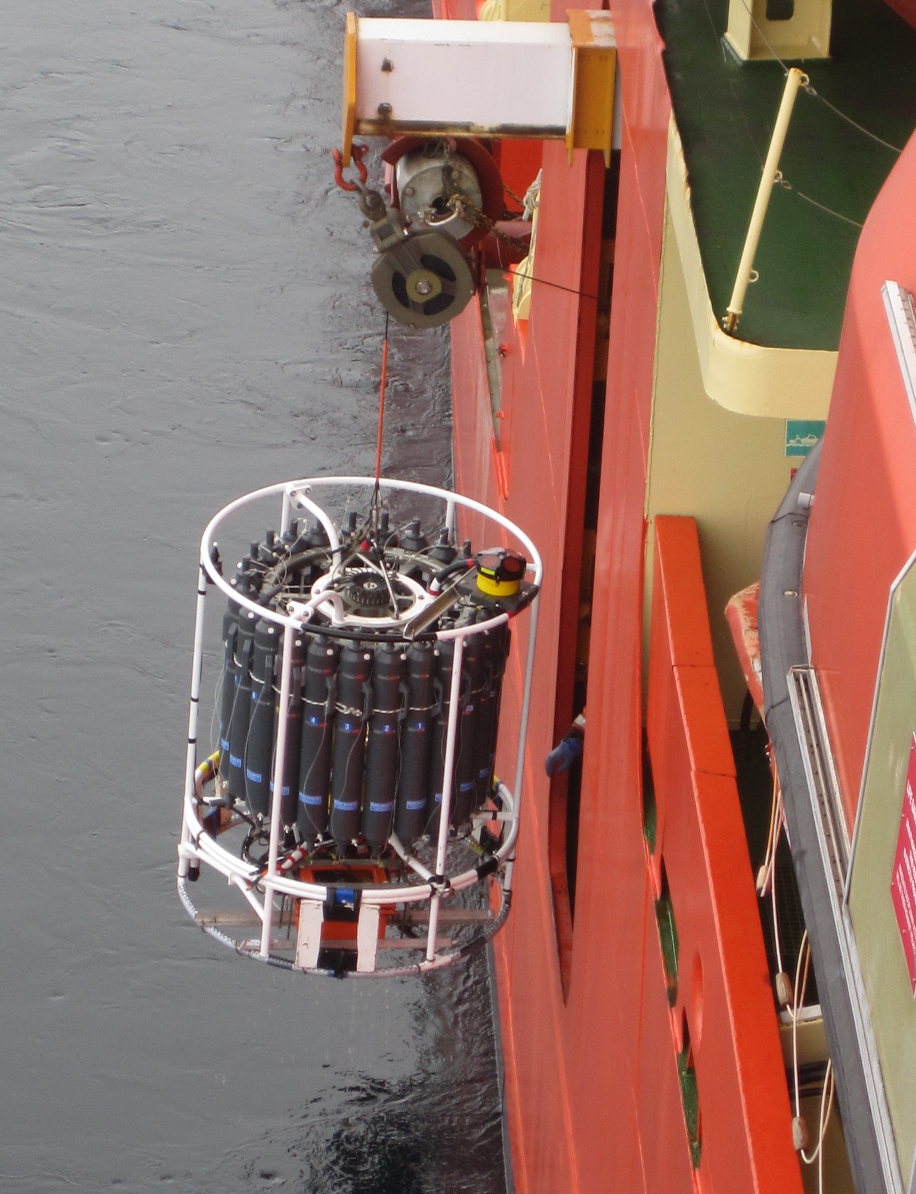 The CTD (conductivity, temperature, and depth instrument) is lowered into the water. Aboard the Nathaniel B. Palmer icebreaker at the Larsen A ice shelf, Weddell Sea, Antarctica.