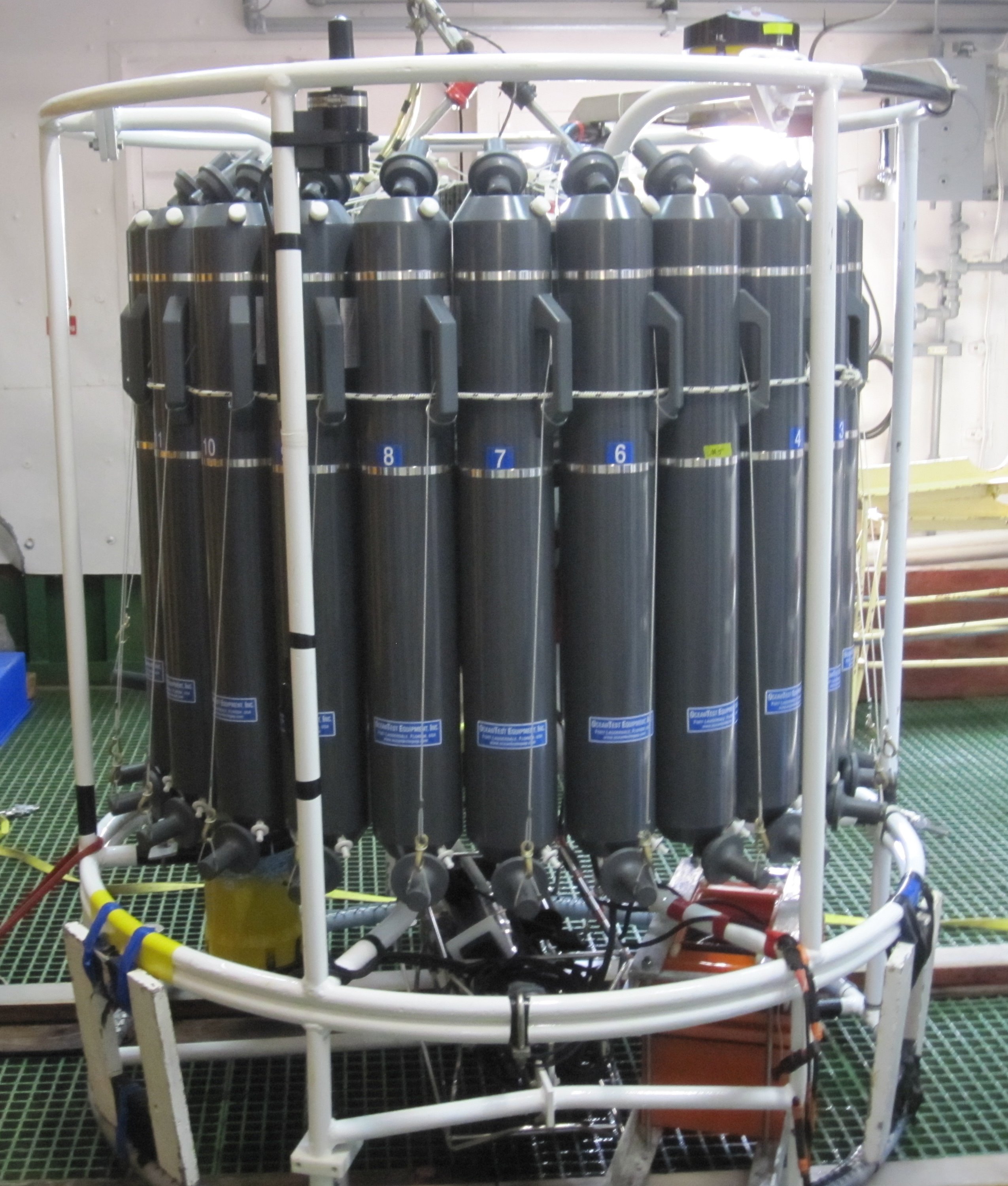 The CTD (conductivity, temperature, and depth instrument) sits in the Baltic Room. Aboard the Nathaniel B. Palmer icebreaker at the Larsen A ice shelf, Weddell Sea, Antarctica.