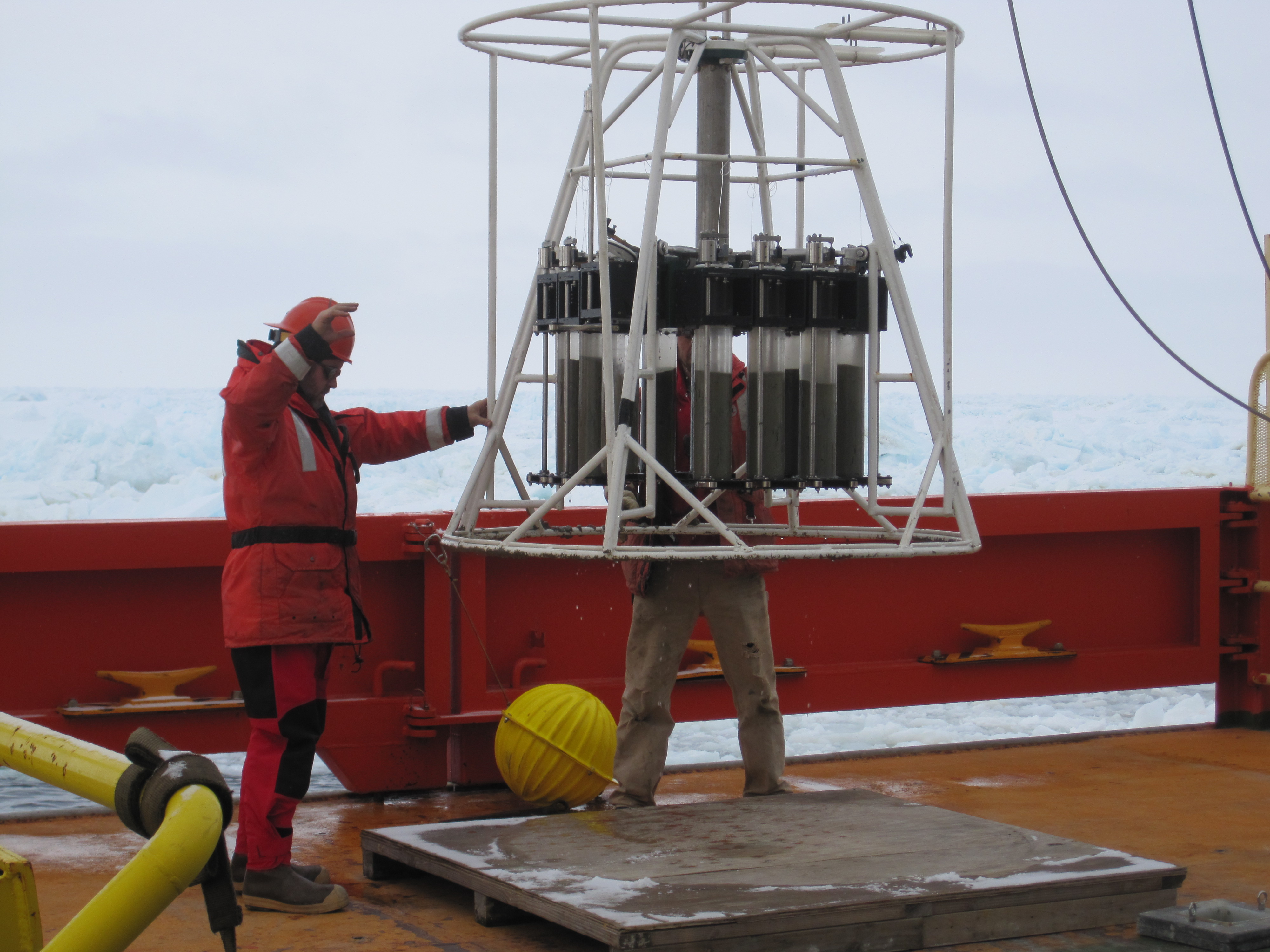 Jeremy Lucke guides the megacore into place on deck. Aboard the Nathaniel B. Palmer icebreaker at the outer Larsen A ice shelf, Weddell Sea, Antarctica.