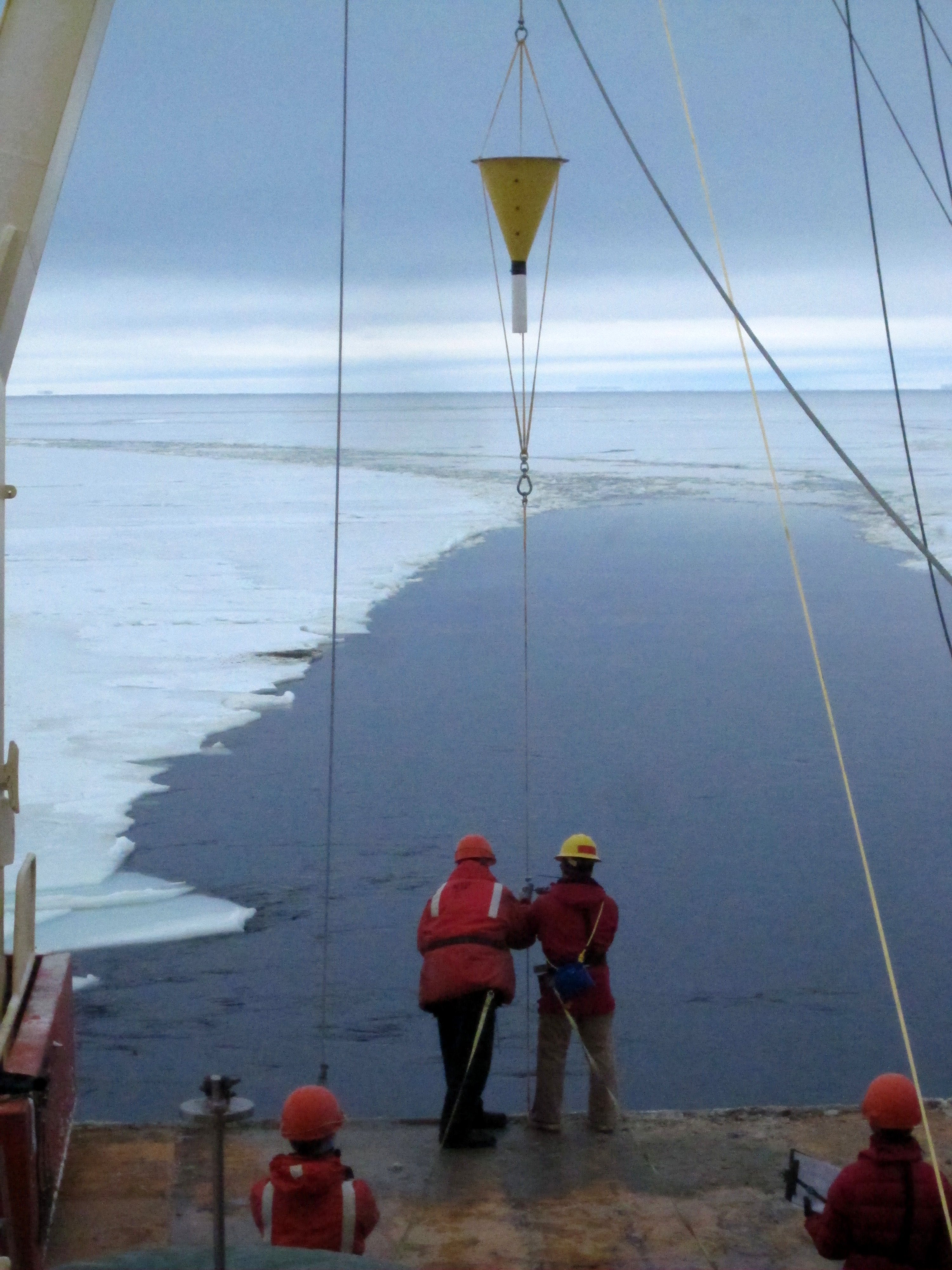 Buzz Scott (left) and Jason Theis (right) with one of the sediment traps. Aboard the Nathaniel B. Palmer icebreaker at the inner Larsen A ice shelf, Weddell Sea, Antarctica.