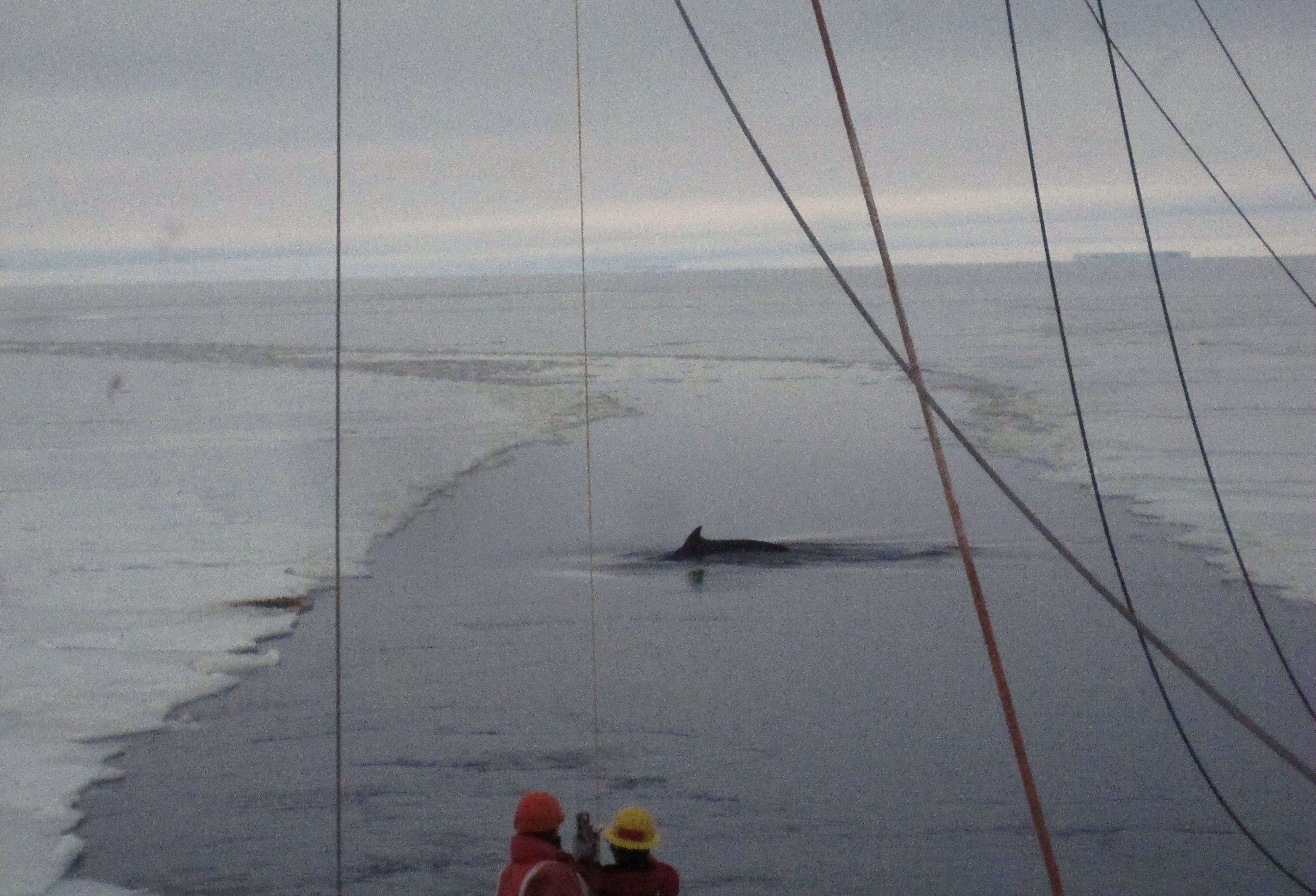 A minke whale surfaces during a mooring installation. Aboard the Nathaniel B. Palmer icebreaker at the inner Larsen A ice shelf, Weddell Sea, Antarctica.