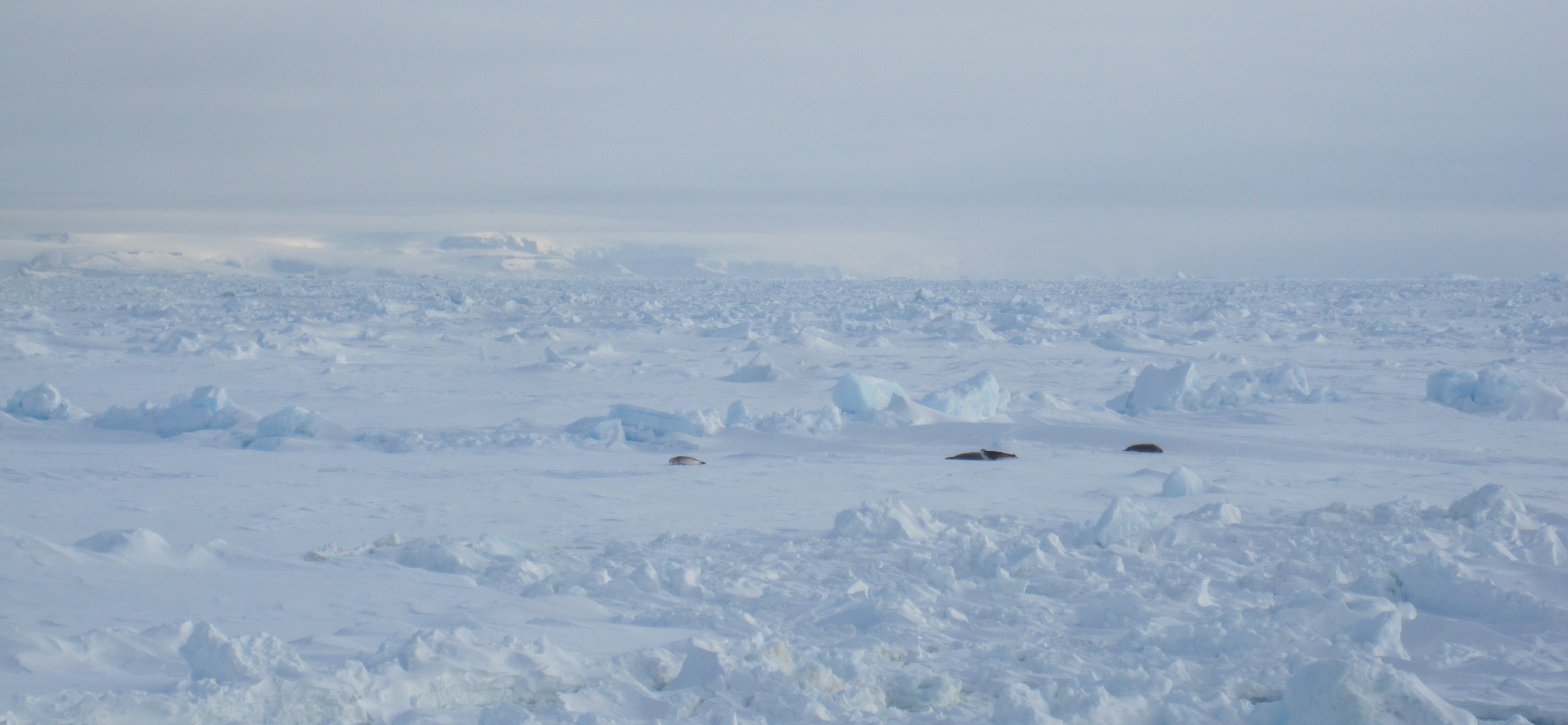 Seals on the pack ice. Aboard the Nathaniel B. Palmer icebreaker in Erebus and Terror Gulf, Antarctica.