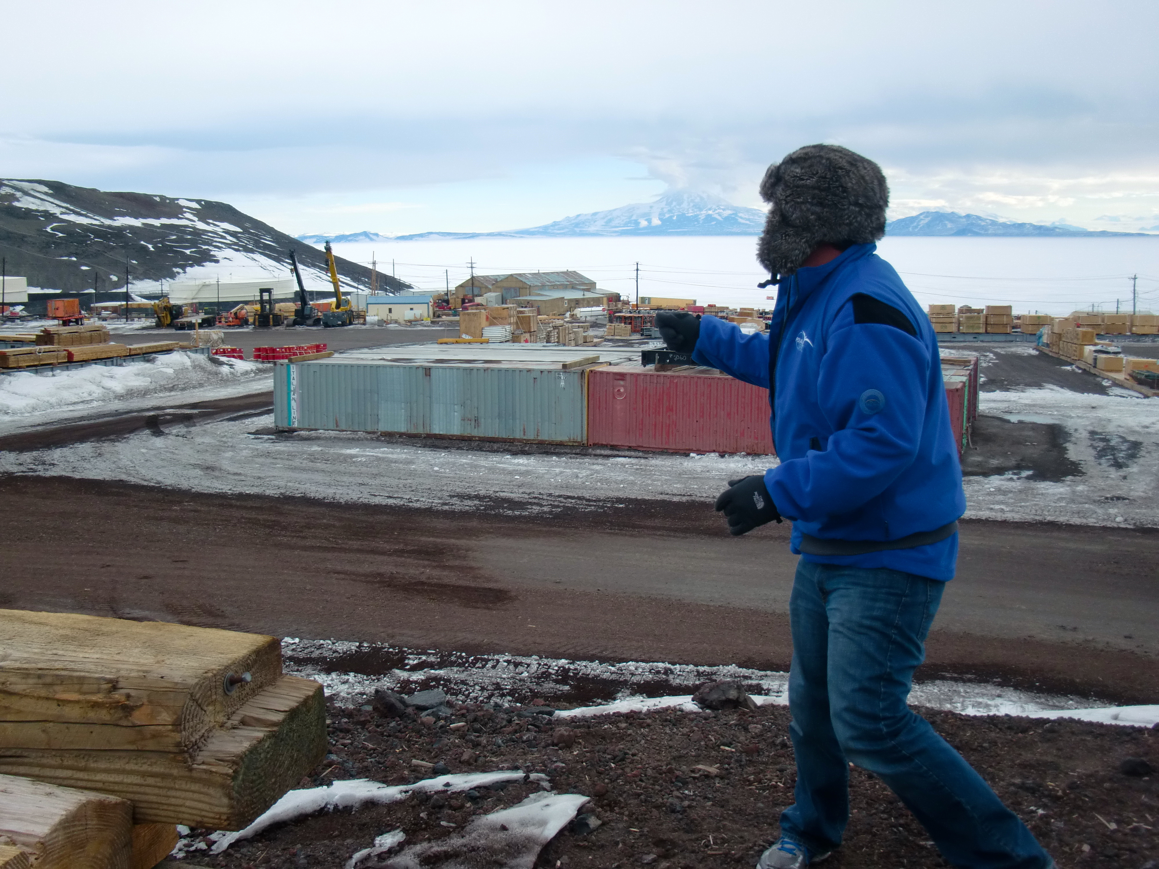 Brian DuBay plays frisbee golf at the McMurdo Supply Yard at McMurdo Station, Antarctica.